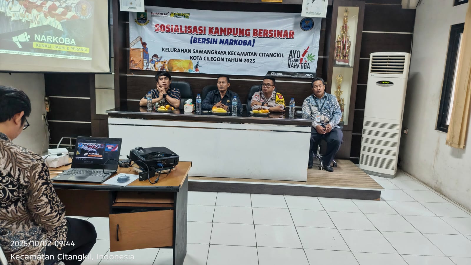 Cilegon - Bertempat di Aula Kantor Kelurahan Samangraya, Bhabinkamtibmas Kelurahan Samangraya Polsek Ciwandan Polres Cilegon Polda Banten BRIPKA Asep Karyudin Hadiri Sosialisasi Kampung Bersih Narkoba (Bersinar), Kamis (02/10/202).