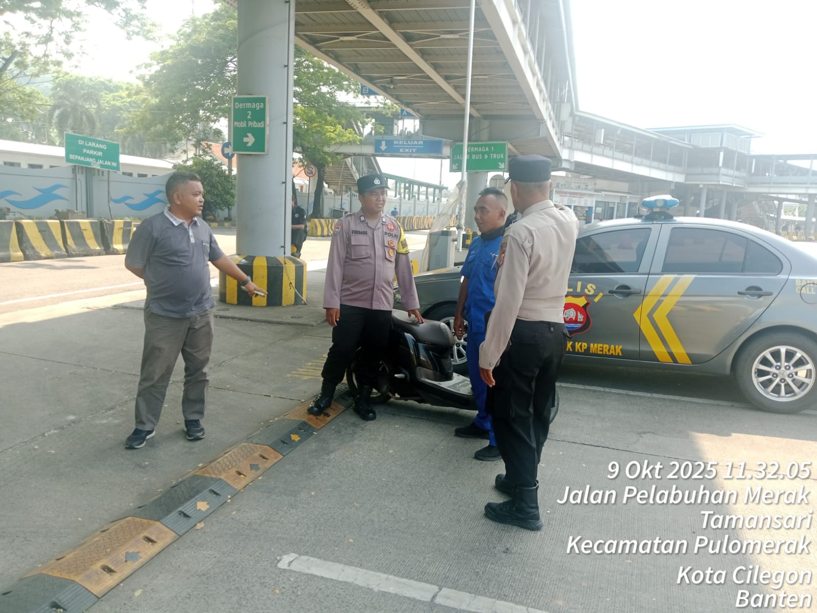 Cilegon - Personel Polsek Kskp Merak Polres Cilegon Polda Banten melaksanakan sambang dan patroli kawasan pelabuhan merak dalam rangka menjaga Harkamtibmas di Kawasan Pelabuhan Merak, Kamis (09/10/2025).