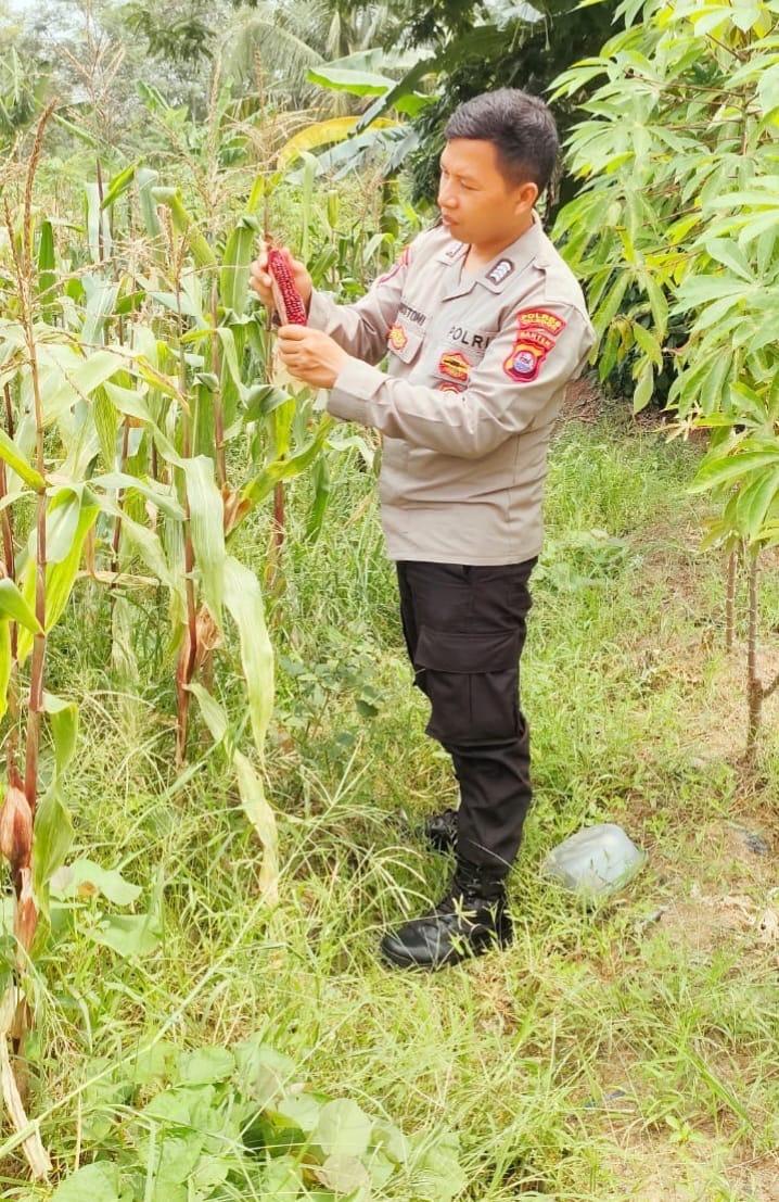 Bripka Agustoni, selaku Babinkamtibmas Kelurahan Kota Bumi, Polsek Purwakarta, melaksanakan kegiatan pengecekan tanaman jagung di wilayah binaannya pada hari ini