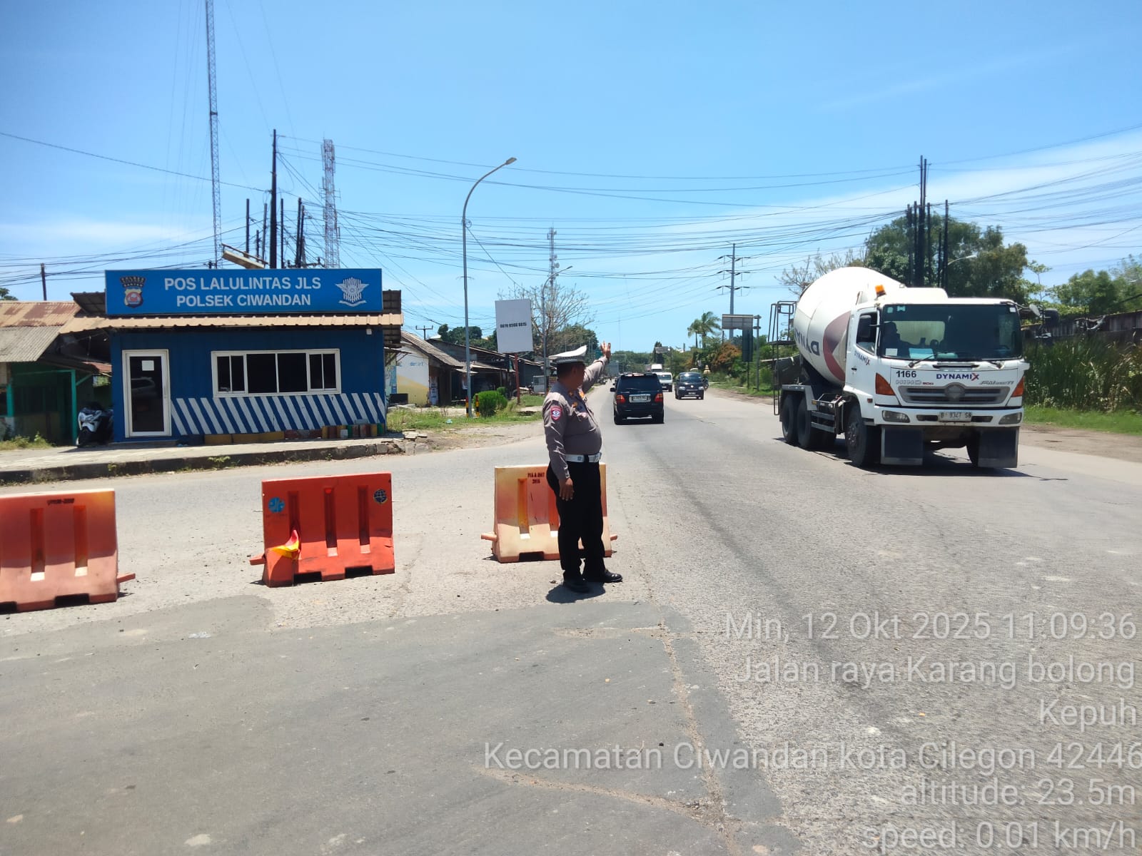 Cilegon - Personil Unit Lantas Polsek Ciwandan Polres Cilegon Polda Banten melaksanakan kegiatan monitoring jalur wisata di depan Pos Lantas JLS Ciwandan, Minggu, (12/10/2025).