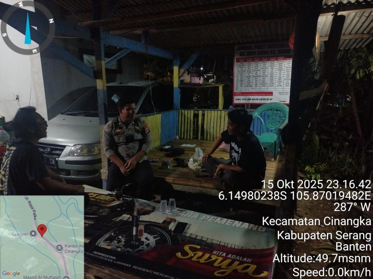 *Polres Cilegon* || Personil Bhabinkamtibmas Polsek Cinangka melaksanakan Program Komandan Wish Kapolda Banten RONDA SATKAMLING menyampaikan komunikasi dengan Petugas Siskamling agar berperan aktif dalam menciptakan Harkamtibmas yang aman dan Kondusif, Kamis (16/10/2025).