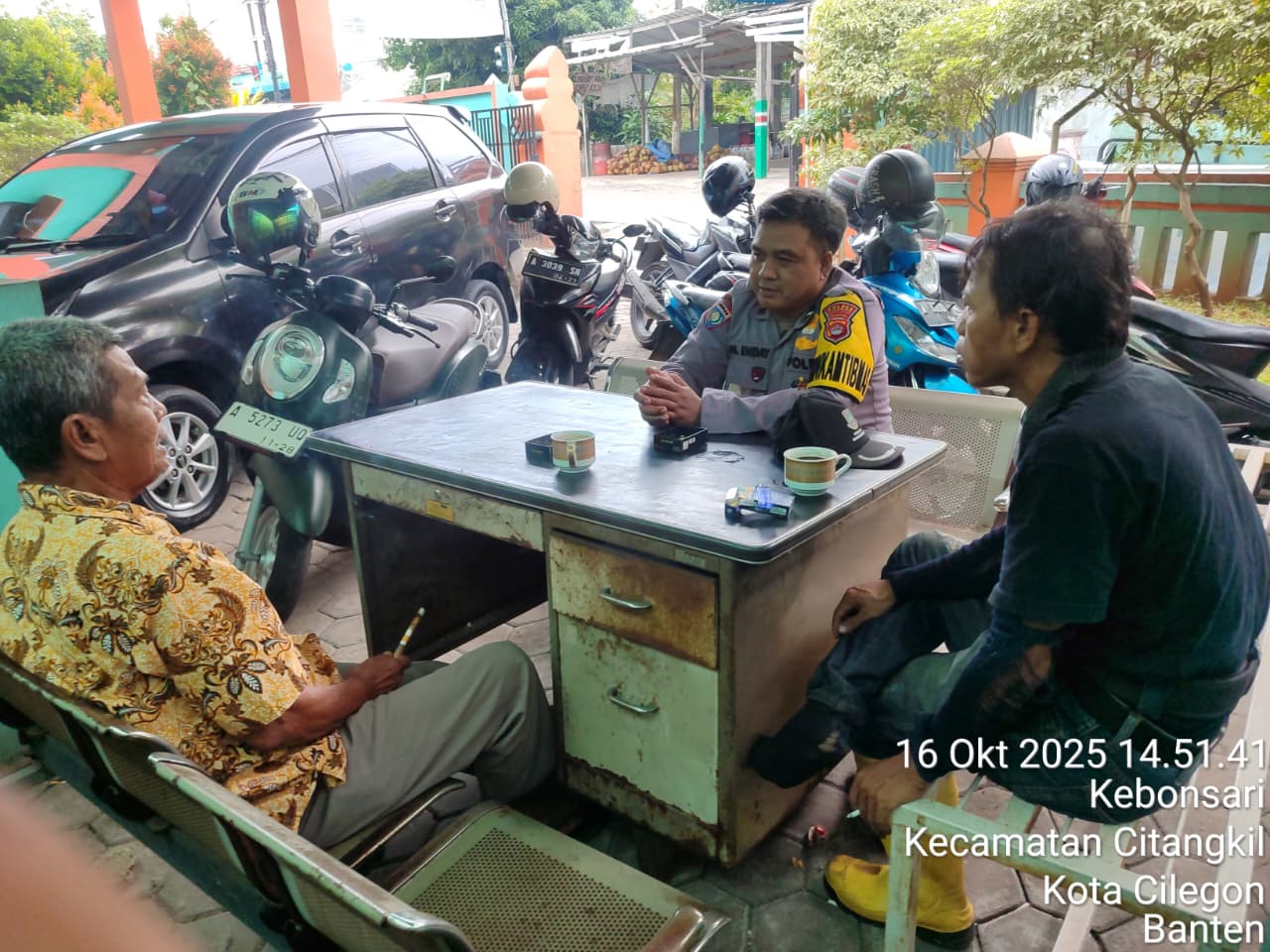 Cilegon - Personil Bhabinkamtibmas Polsek Ciwandan Polres Cilegon Polda Banten Menyampaikan Pesan Kamtibmas dan mengajak masyarakat terus aktif dalam kepedulian terhadap Pemeliharaan keamanan lingkungan di daerah Binaanya, Kamis (16/10/2025).