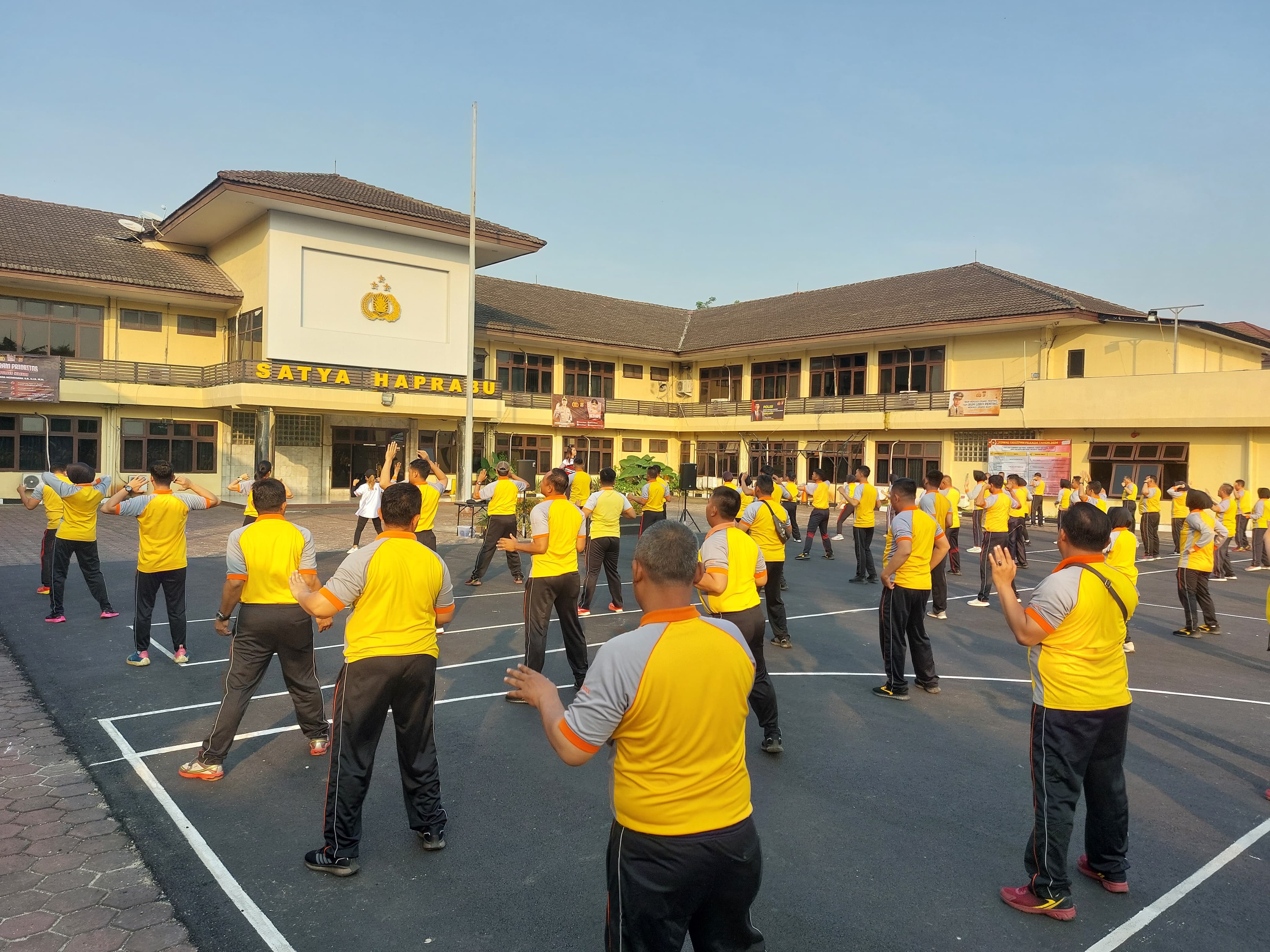 Cilegon,Polres Cilegon Polda Banten Pada Jumat/17/10/2025 Pukul 07.15 Wib, Personil  Polres Cilegon, melaksanakan kegiatan olahraga mandiri di lapangan Polres Cilegon dan melaksanakan senam aerobik di Lapangan polres cilegon.