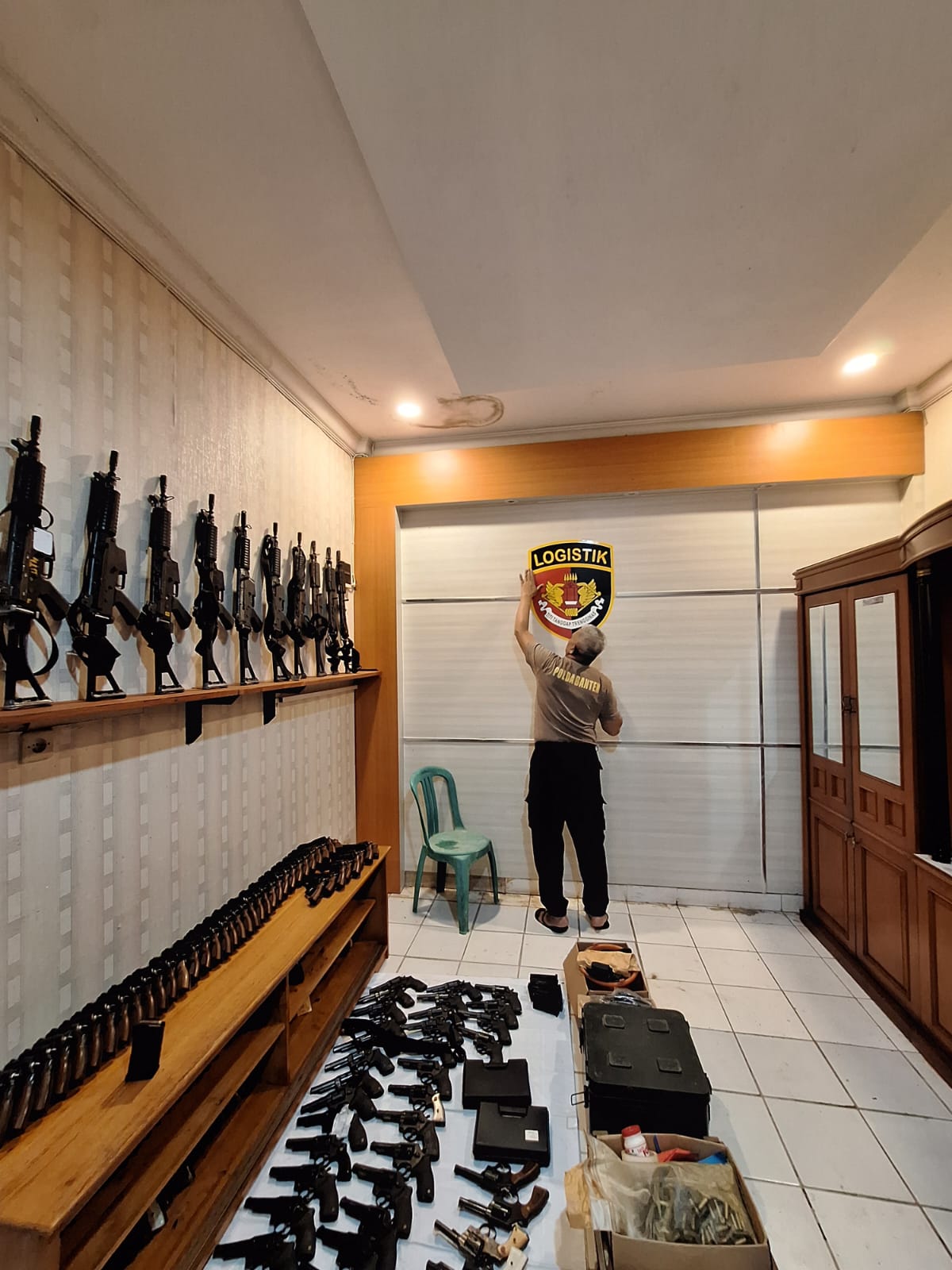 STAFF LOGISTIK MEMBERSIHKAN SENJATA API DI GUDANG POLRES CILEGON