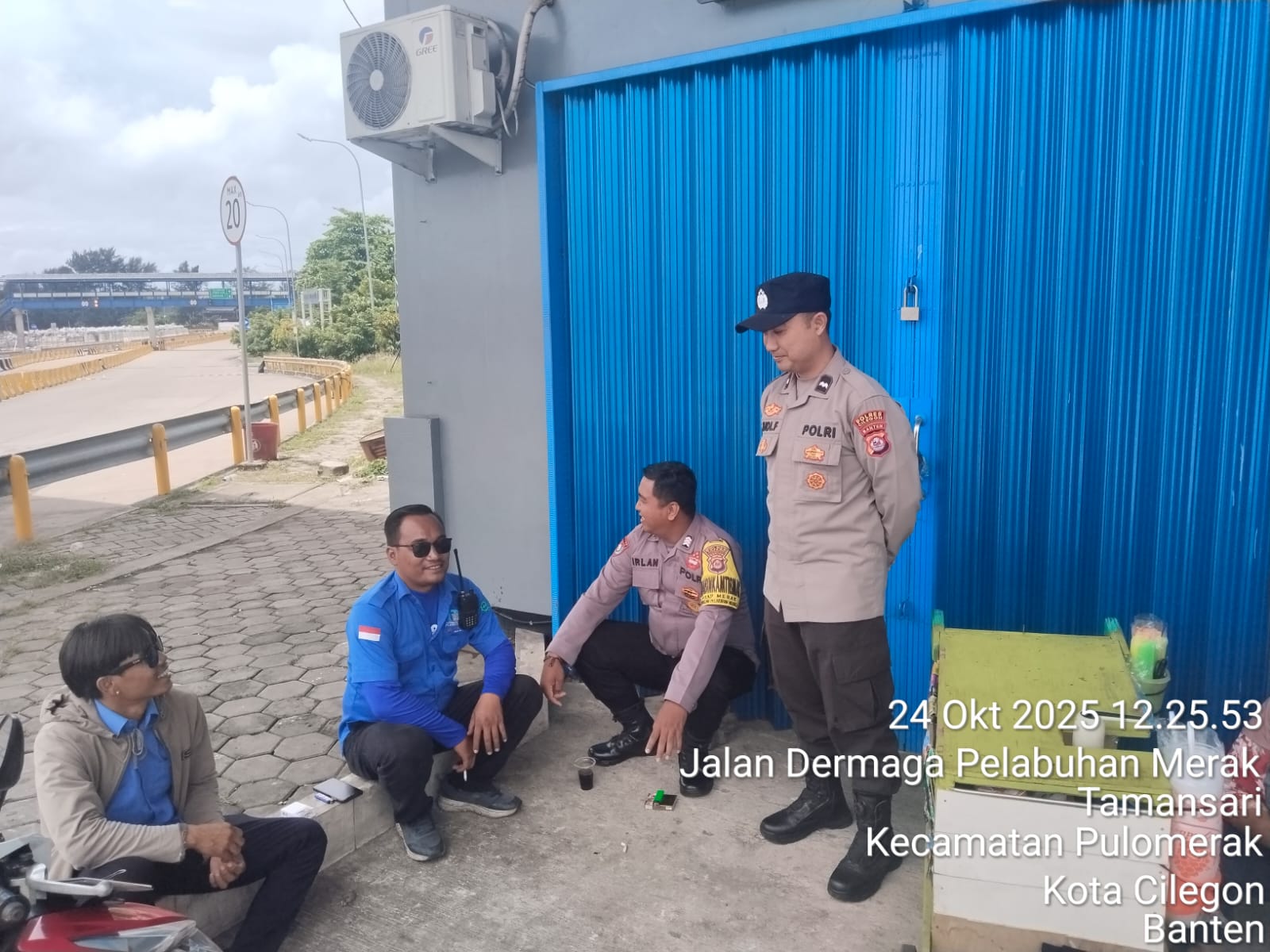 Cilegon - Personel Polsek Kskp Merak Polres Cilegon Polda Banten melaksanakan sambang dan patroli kawasan pelabuhan merak dalam rangka menjaga Harkamtibmas di Kawasan Pelabuhan Merak, Jumat (24/10/2025).