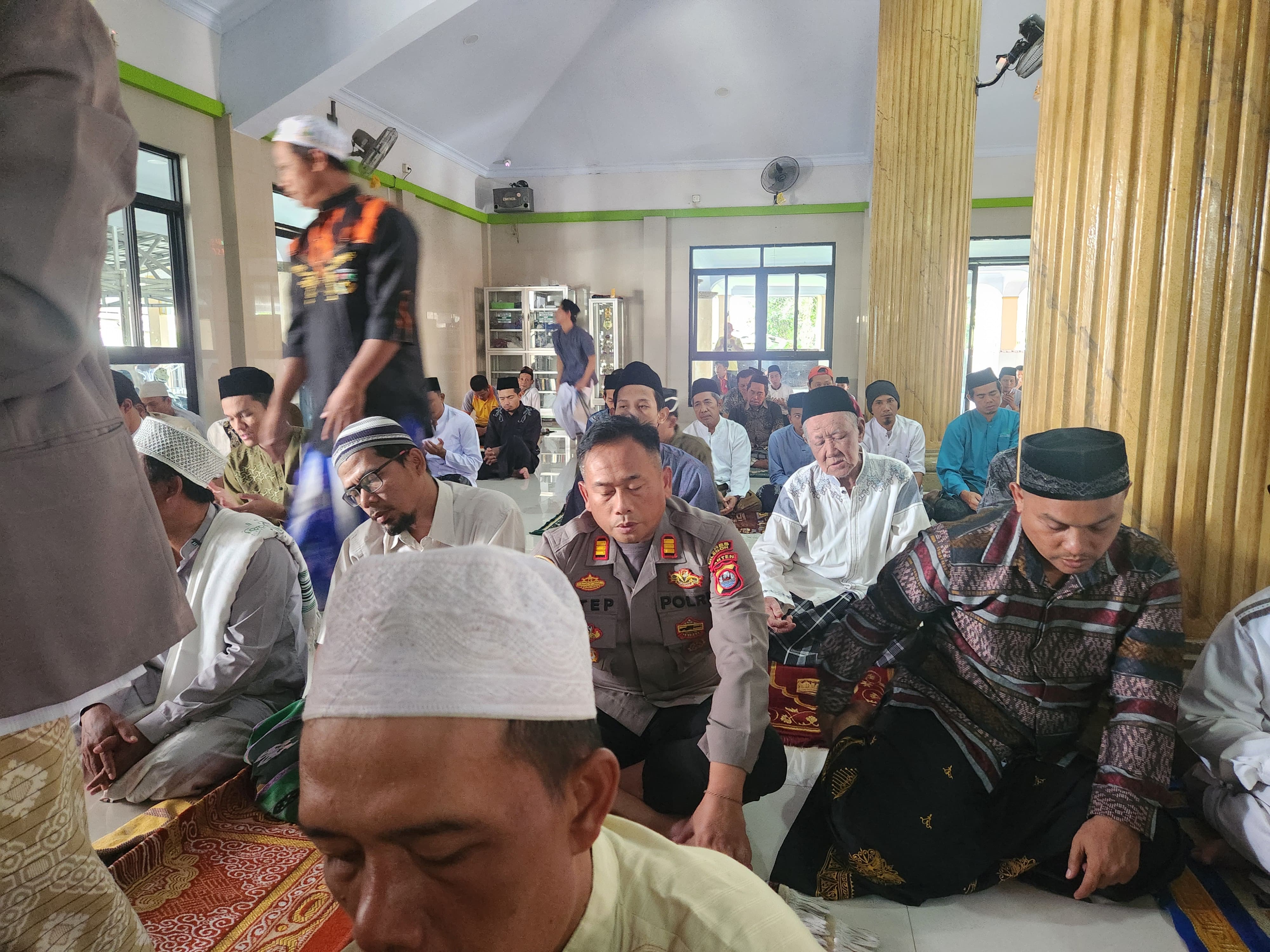 Seperti Tadi Saya Melaksanakan Kegiatan Jumat keliling di Masjid Nurul Ibad Link Sambirata Kelurahan Cibeber Kecamatan Cibeber Kota Cilegon setelah pelaksanaan kegiatan sholat kami laksanakan bincang bincang dengan masyarakat guna menciptakan situasi Kamtibmas diwilayah kecamatan Cibeber Kota Cilegon. Ujar Akp Sigit Dermawan.