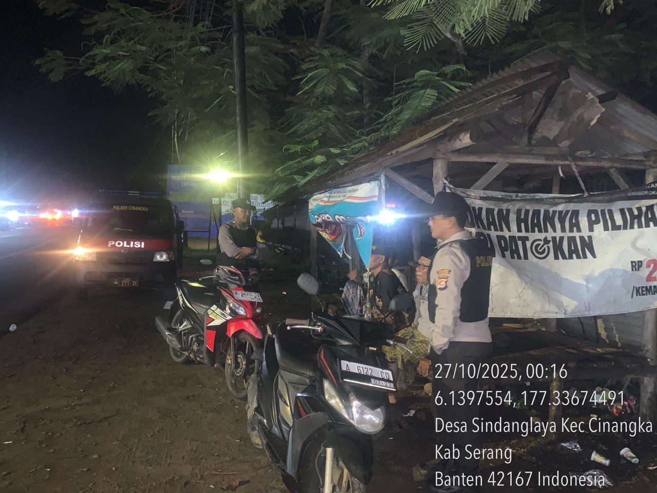 *Cilegon* – Dalam Rangka Pencegahan Kejahatan Jalanan dan Memelihara situasi keamanan dan menjaga serta memberikan rasa aman dan nyaman di masyarakat,Salah satu upaya untuk mewujudkan hal tersebut sebagaimana yang dilakukan oleh Personil Polsek Cinangka Polres Cilegon Polda Banten melaksanakan giat patroli blue light malam hari hingga menjelang pagi, Senin (27/10/2025).