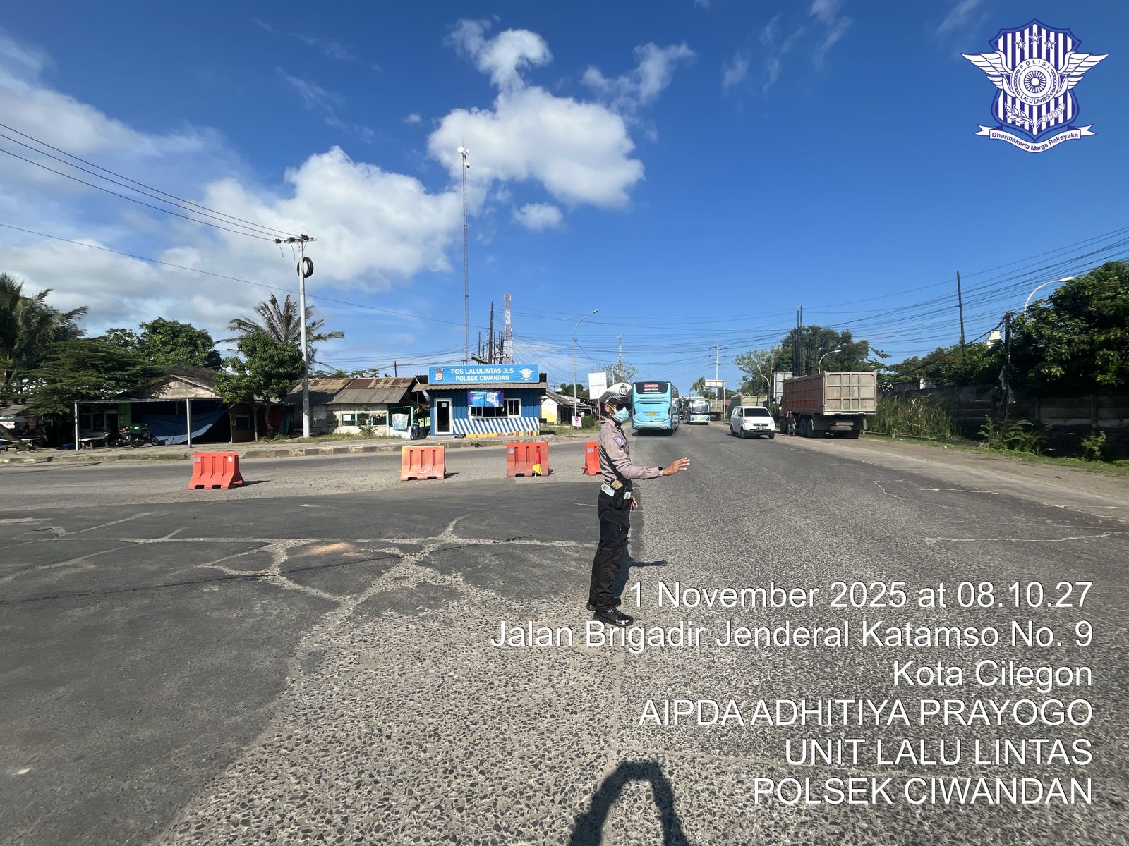 Cilegon - Personil Unit Lantas Polsek Ciwandan Polres Cilegon Polda Banten melaksanakan kegiatan monitoring jalur wisata di depan Pos Lantas JLS Ciwandan, Sabtu, (01/11/2025).