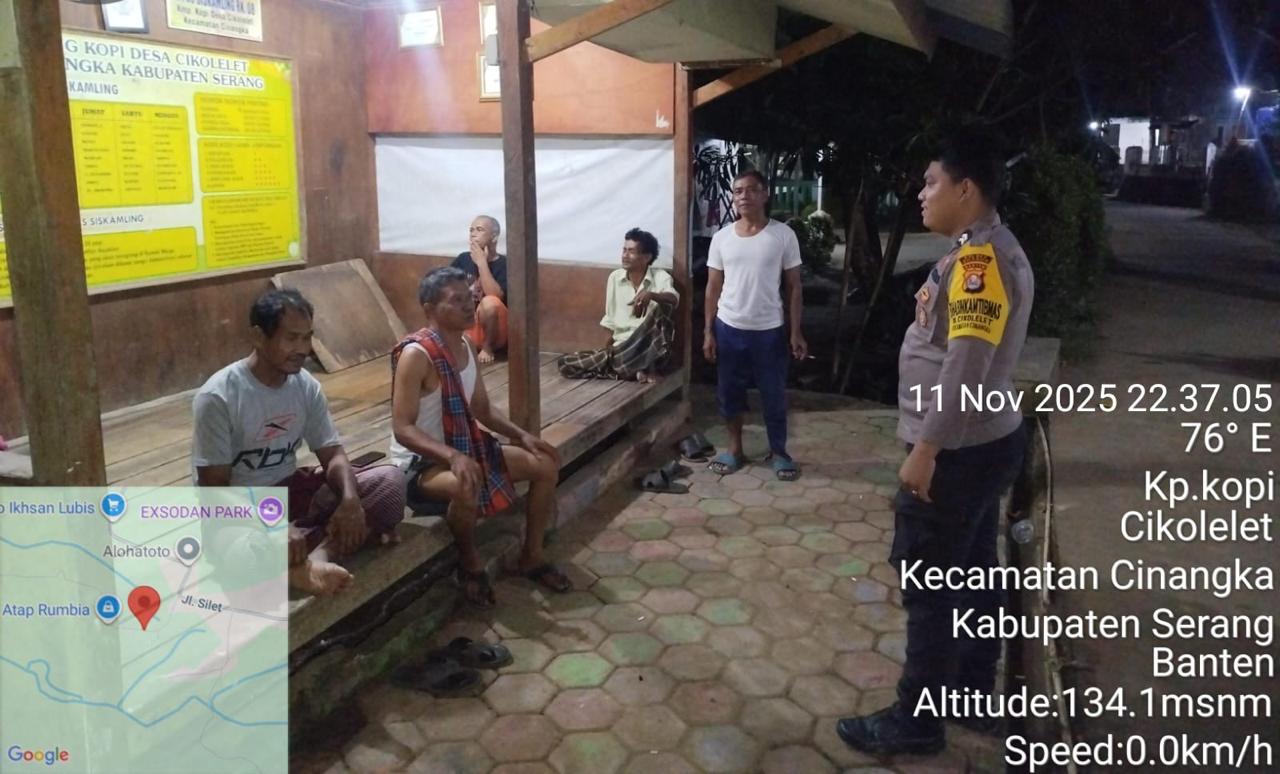 *Polres Cilegon* || Personil Bhabinkamtibmas Polsek Cinangka melaksanakan Program Komandan Wish Kapolda Banten RONDA SATKAMLING menyampaikan komunikasi dengan Petugas Siskamling agar berperan aktif dalam menciptakan Harkamtibmas yang aman dan Kondusif, Rabu (12/11/2025).