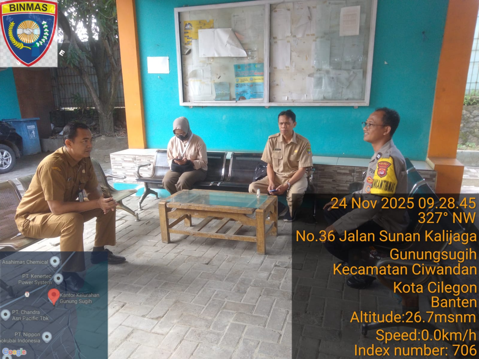 Cilegon - Dalam upaya memberikan rasa aman kepada masyarakat Bhabinkamtibmas Polsek Ciwandan Polres Cilegon Polda Banten melakukan upaya dalam mencegah gangguan kamtibmas,seperti melaksanakan giat sambang di kantor-kantor kelurahan  bertemu langsung dengan perangkat kelurahan, Selasa (25/11/2025).