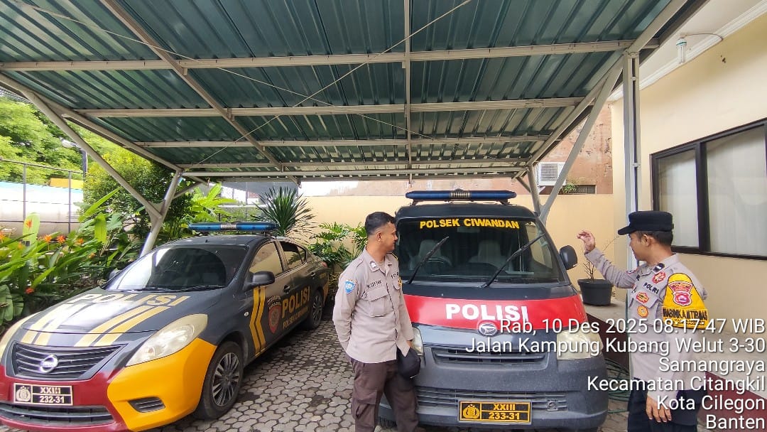 Cilegon - Ka SPKT Polsek Ciwandan Polres Cilegon Polda Banten Pimpin langsung pengecekan kendaraan Dinas Dan Inventaris Polsek Ciwandan Saat Serah terima Tugas Penjagaan, khususnya mobil patroli, Selasa (09/12/2025).
