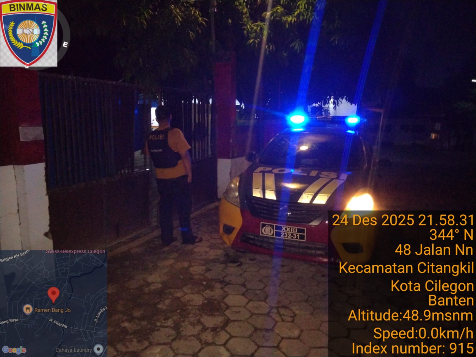 Cilegon - Personil Polsek Ciwandan Polres Cilegon Polda Banten Dalam Pelaksanaan Kegiatan Patroli dengan menyalakan lampu rotator berwarna biru di Daerah Hukum Polsek Ciwandan Polres Cilegon Polda Banten dari malam hingga dini hari, dalam rangka menciptakan situasi aman dan kondusif, Kamis (25/12/2025).