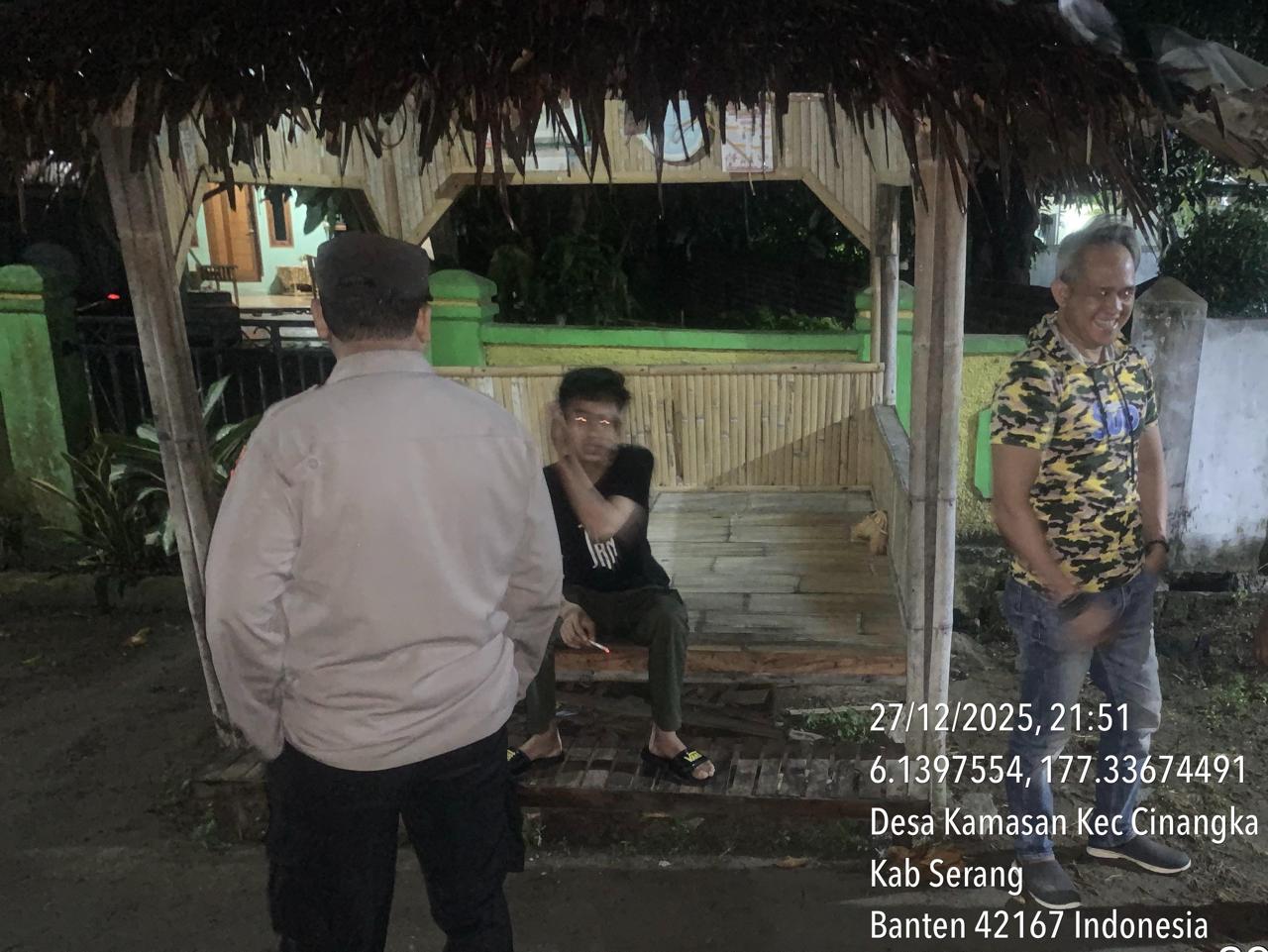 *Polres Cilegon* || Personel Bhabinkamtibmas Polsek Cinangka melaksanakan Program Komandan Wish Kapolda Banten RONDA SATKAMLING menyampaikan komunikasi dengan Petugas Siskamling agar berperan aktif dalam menciptakan Harkamtibmas yang aman dan Kondusif, Minggu (28/12/2025).