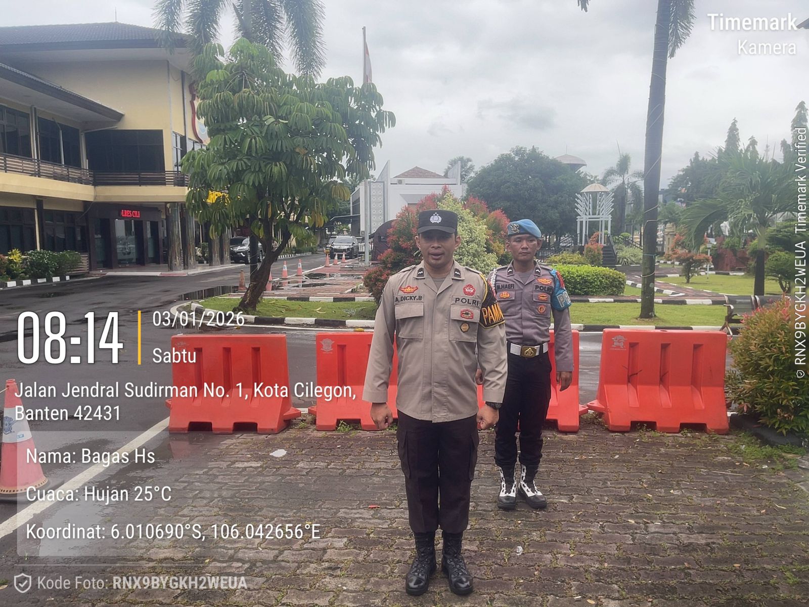 Cilegon, personel Satreskrim Polres Cilegon Polda Banten melaksanakan piket di penjagaan pintu masuk Polres Cilegon Polda Banten untuk memastikan mako Polres Cilegon dalam keadaan aman dan nyaman dalam melayani Masyarakat tanpa adanya gangguan kejahatan. Jumat  (03/01/2026).