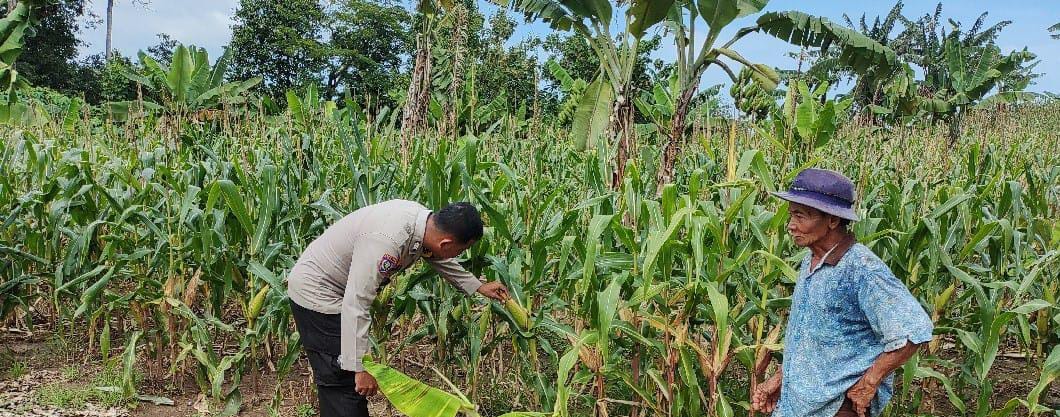 Dalam kegiatan monitoring ini, Bhabinkamtibmas meninjau langsung kondisi lahan jagung.