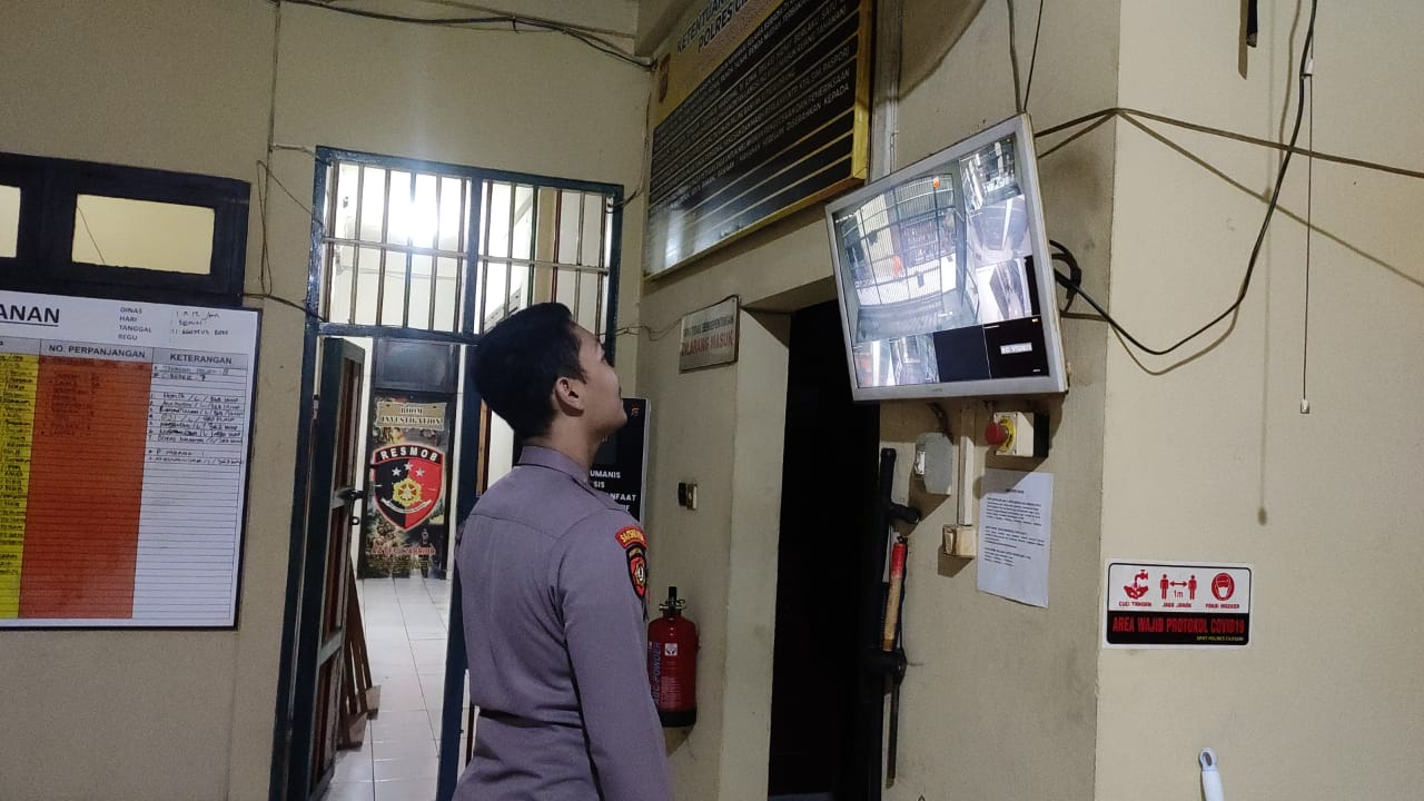 Personil Sat Tahti Cek Tahanan melalui CCTV yang ada di Rutan Polres Cilegon.
