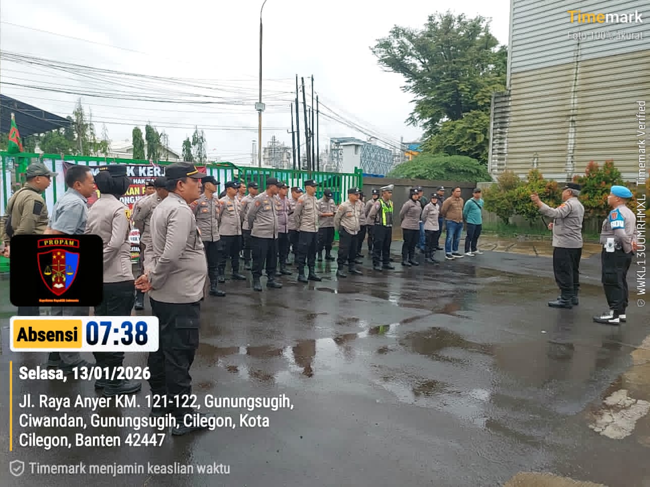 Selasa (12/01/2026) Polres Cilegon melaksanakan pengamanan aksi unjuk rasa (unras) di PT. Dongjin Indonesia, Cilegon, pada hari ini. Aksi unjuk rasa ini dilakukan oleh sekelompok buruh yang menuntut perbaikan kondisi kerja dan upah yang lebih baik.