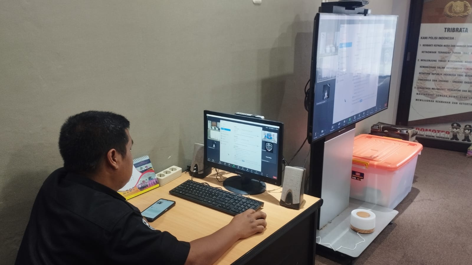 Anggota Tik Polres Cilegon Menyiapkan Sarana dan Prasarana Untuk Kegiatan Zoom meeting Dalam pelaksanaan kegiatan zoom meeting tersebut anggota TIK Polres Cilegon yang bertanggung jawab untuk menyiapkan peralatan zoom. Selain itu agar di tidak ada gangguan jaringan sebelum pelaksanaan anggota TIK melakukan pemeriksaan terhadap sarana dan prasarana tersebut . Satu jam sebelum kegiatan zoom meeting itu dimulai. Kapolres Cilegon AKBP. DR. MARTUA RAJA TARIPAR LAUT SILITONGA. melalui Kasi TIK AIPTU Suwanto, S.H. menyampaikan bahwa “untuk menunjang kelancaran penyampaian informasi anggota TIk Polres Cilegon selalu memeriksa sarana dan prasarana tersebut, sebelum maupun pada saat pelaksanaan akan selalu di monitor”
