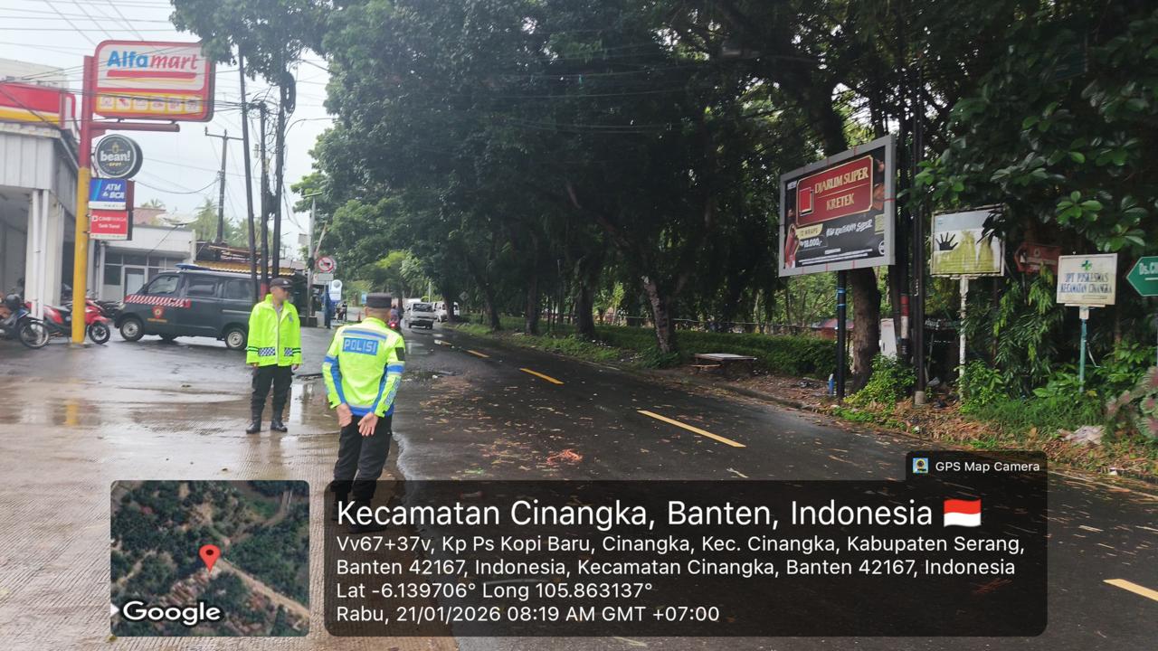 *Polres Cilegon* - Dalam Mewujudkan Aksi Nyata Pelayanan Kepada Masyarakat,Personil Polsek Cinangka Polres Cilegon Polda Banten Laksanakan Strong Poin Pengaturan Lalu-lintas, Kamis (22/01/2026).