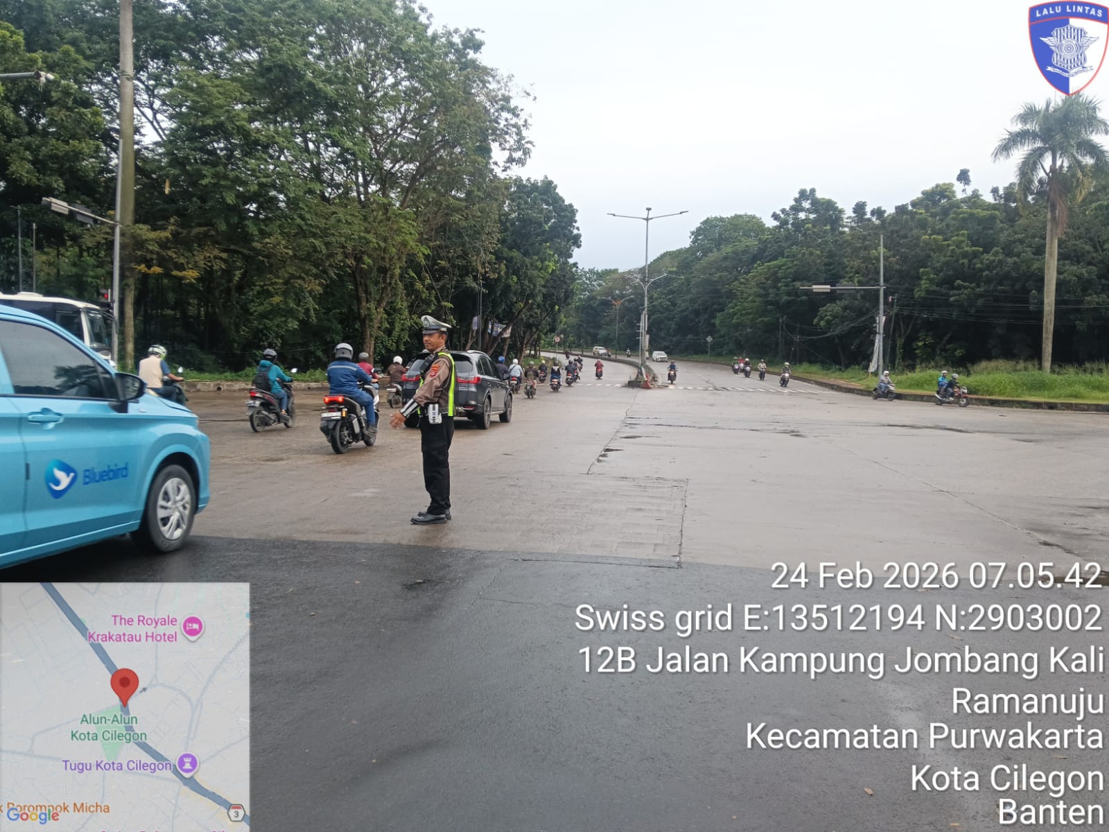Cilegon, Satlantas Polres Cilegon Polda Banten – Berikan pelayanan kepada masyarakat Kasat lantas Polres Cilegon AKP Ridwan memerintahkan jajaran lalulintas untuk melaksanakan pengaturan lalu lintas di penggal – penggal jalan yang rawan kemacetan di Kota Cilegon, (Selasa,24/2/2026)