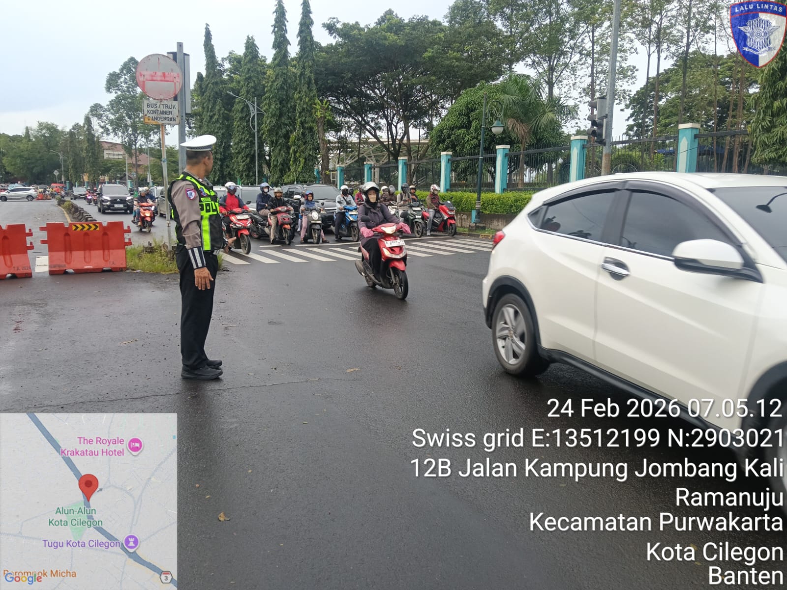 Cilegon, Satlantas Polres Cilegon Polda Banten – Berikan pelayanan kepada masyarakat Kasat lantas Polres Cilegon AKP Ridwan memerintahkan jajaran lalulintas untuk melaksanakan pengaturan lalu lintas di penggal – penggal jalan yang rawan kemacetan di Kota Cilegon, (Selasa,24/2/2026)