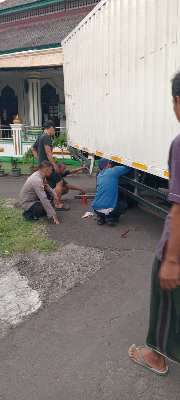 Cilegon - Bhabinkamtibmas Kelurahan Citangkil, AIPDA Warudin, bersama lurah dan linmas, melaksanakan evakuasi mobil box yang terperosok di tengah saluran air di Linkungan Citangkil, RT 03 RW 01, Kelurahan Citangkil, Kecamatan Citangkil, Kota Cilegon. Mobil box yang bermuatan air mineral tersebut berhasil dievakuasi menggunakan dongkrak dan balok kayu, Kamis (26/02/2026).