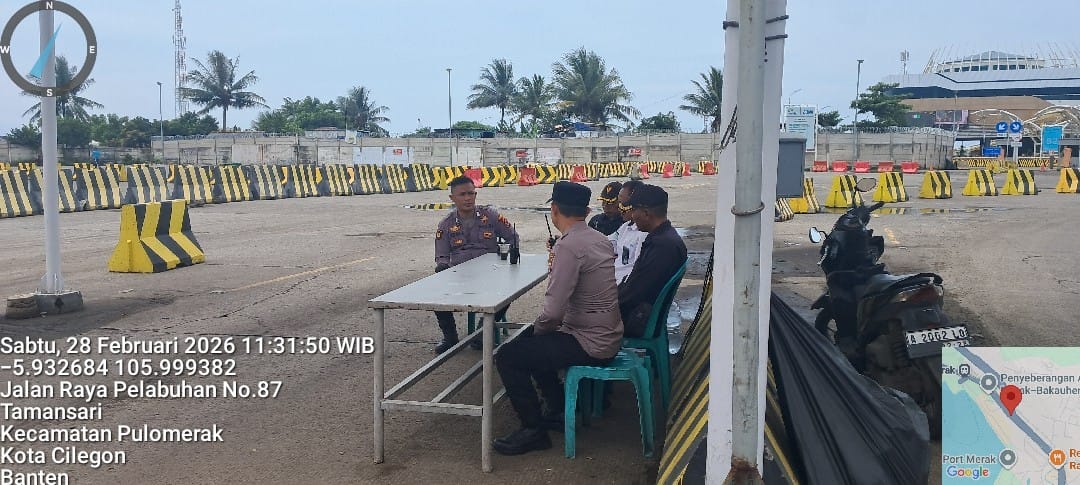 \Cilegon - Personel Polsek Kskp Merak Polres Cilegon Polda Banten melaksanakan sambang dan patroli kawasan pelabuhan merak dalam rangka menjaga Harkamtibmas di Kawasan Pelabuhan Merak, Sabtu (28/02/2026).
