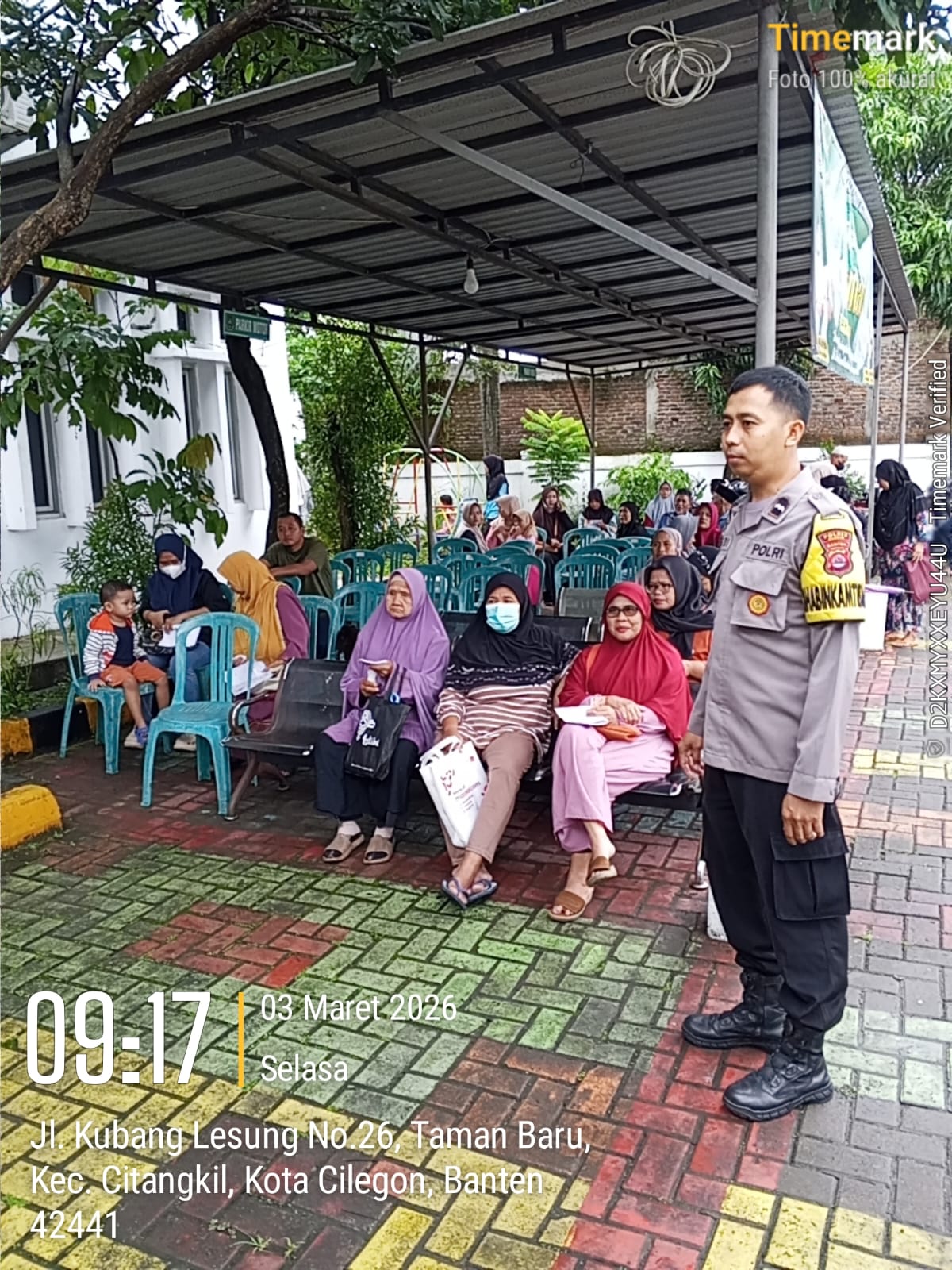 Cilegon - Bhabinkamtibmas Kelurahan Tamanbaru Polsek Ciwandan Polres Cilegon Polda Banten AIPDA Edianto, memonitor kegiatan penyerahan bantuan dari Badan Amil Zakat Nasional (Baznas) Kota Cilegon kepada anak yatim dan dhuafa di Halaman Kantor Kelurahan Tamanbaru, Kecamatan Citangkil, Kota Cilegon, Selasa (03/03/2026).