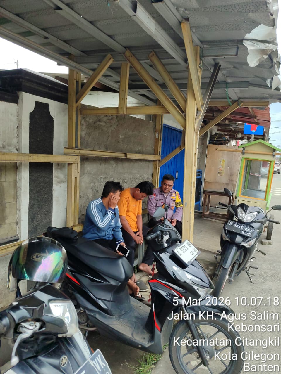 Cilegon - Guna mencegah gangguan kamtibmas, Personil Polsek Ciwandan Polres Cilegon Polda Banten melaksanakan giat Patroli dialogis dipangkalan Ojek (Opang) Pertigaan Simpang Warnasari Kelurahan Kebonsari kecamatan Citangkil, Kamis (05/03/2026).