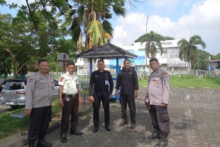 Personel Polsek Purwakarta Polres Cilegon melaksanakan kegiatan patroli dialogis sekaligus menyapa petugas Satpam di kawasan Wisma Krakatau Water World