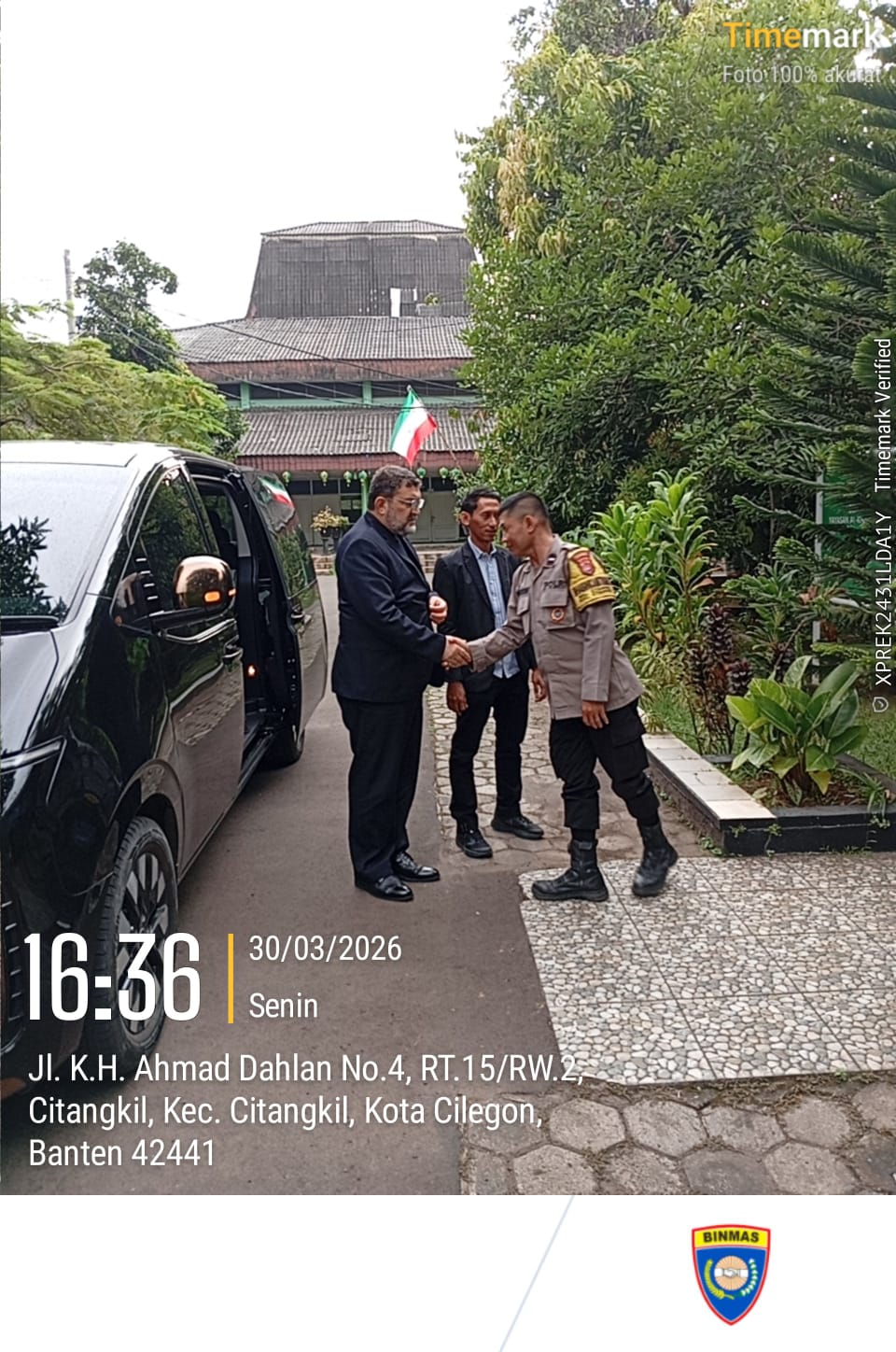 Cilegon -  Bhabinkamtibmas Kelurahan Citangkil Polsek Ciwandan Polres Cilegon Polda Banten AIPDA Warudin, menghadiri kegiatan Halal Bihalal PB Alkhairiyah bersama Duta Besar Republik Islam Iran, MUMAMMAD BOROUJERDI, dan tim di Aula PB Alkhairiyah, Citangkil, Senin (30/03/2026).