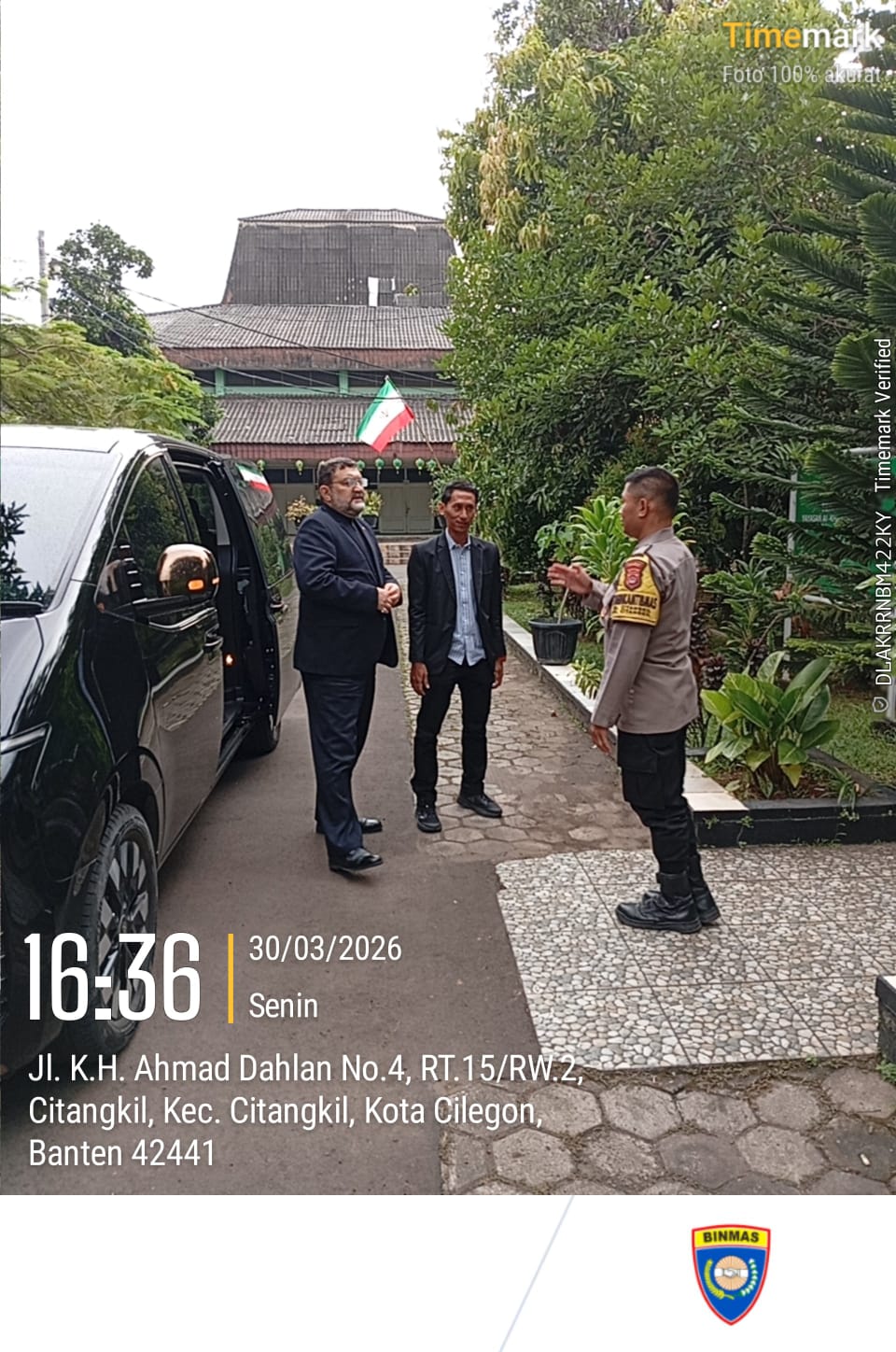 Cilegon - Bhabinkamtibmas Kelurahan Citangkil Polsek Ciwandan Polres Cilegon Polda Banten AIPDA Warudin, menghadiri kegiatan Halal Bihalal PB Alkhairiyah bersama Duta Besar Republik Islam Iran, MUMAMMAD BOROUJERDI, dan tim di Aula PB Alkhairiyah, Citangkil, Senin (30/03/2026).