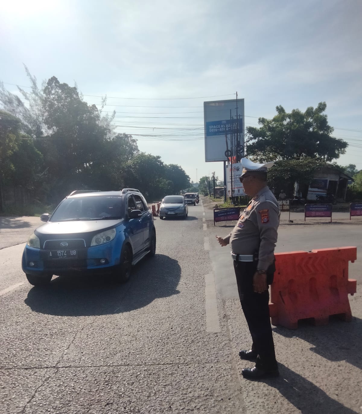 Cilegon - Personil Unit Lantas Polsek Ciwandan Polres Cilegon Polda Banten melaksanakan kegiatan monitoring jalur wisata di depan Pos Lantas JLS Ciwandan, Minggu (12/04/2026).