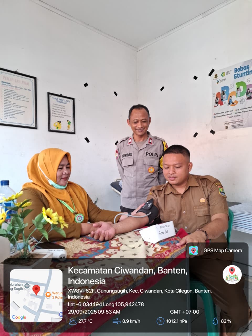 Cilegon - Dalam rangka mendukung program kesehatan masyarakat, Bhabinkamtibmas Kelurahan Gunung Sugih Polsek Ciwandan Polres Cilegon Polda Banten AIPTU Tri Widodo menyambangi kegiatan Dalam Rangka Memperingati Haru Tuberkulosis sedunia yang diselenggarakan di Lingkungan Kelurahan Gunung Sugih Kecamatan Ciwandan Kota Cilegon,  (03/10/2025).