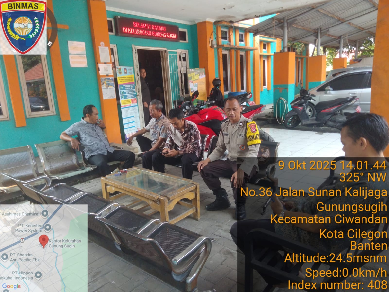 Cilegon – Bhabinkamtibmas Polsek Ciwandan Polres Cilegon Polda Banten yaitu dengan menyambangi kantor Kelurahan binaannya guna membantu dan memantau langsung proses Pelayanan Masyarakat, Kamis (09/10/2025).