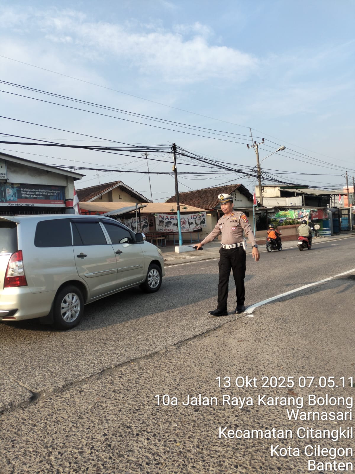 Cilegon - Personil Polsek Ciwandan Polres Cilegon Polda Banten melaksanakan giat Strong Poin Pengaturan Lalu Lintas Disimpang Brown Kelurahan Gunung Sugih guna menciptakan ketertiban, keamanan dan Kelancaran Lalu-lintas bagi masyarakat, Senin (13/10/2025).