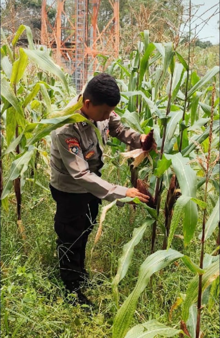Bripka Agustoni, Babinkamtibmas Polsek Purwakarta Bantu Petani Panen Jagung di Kotabumi