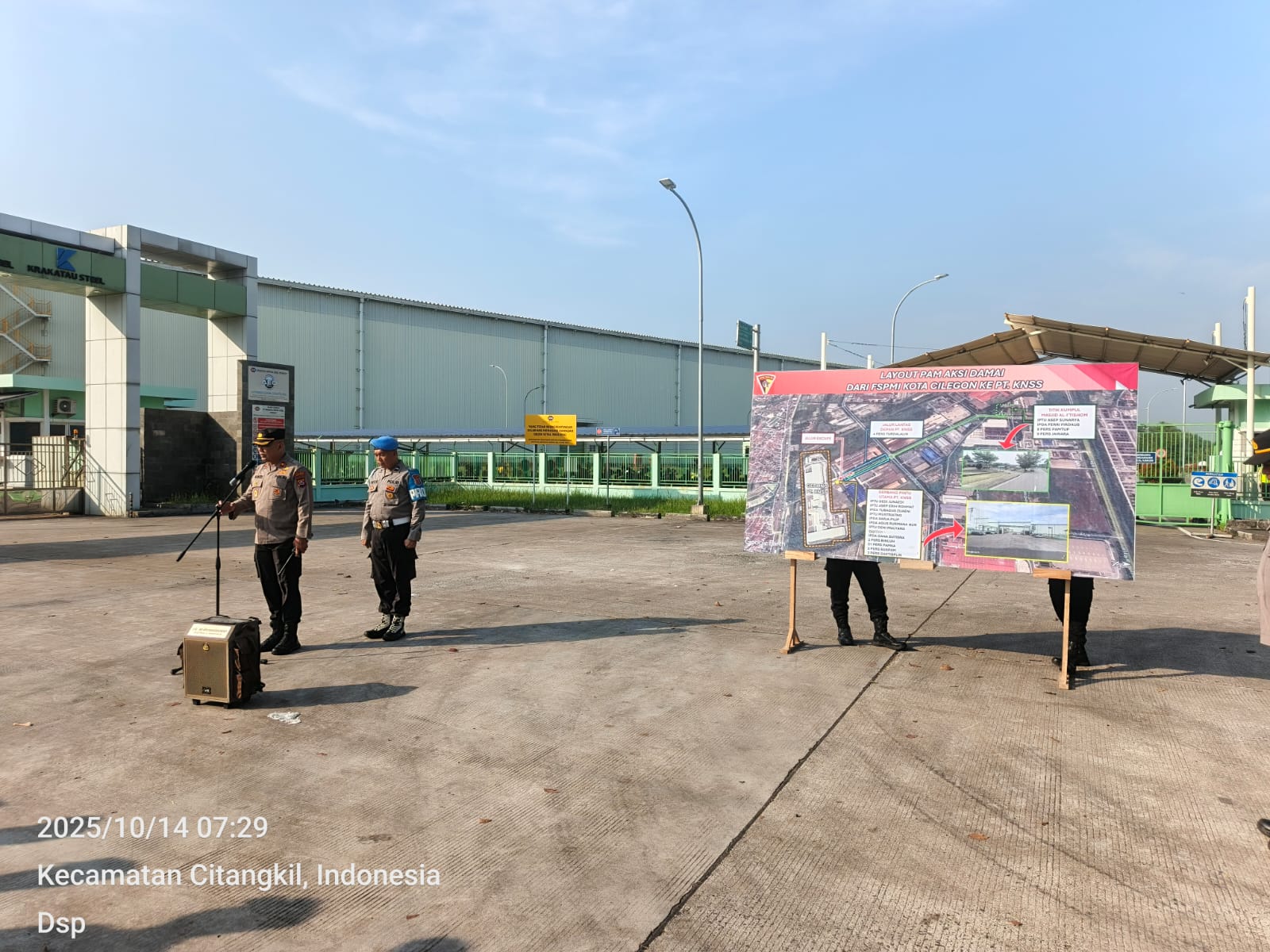 Cilegon - Kapolsek Ciwandan KOMPOL Andi Suherman Pimpin Apel pengamanan aksi damai dari Serikat Pekerja FSPMI Kota Cilegon ke PT. KNSS Cilegon pada Selasa, (14/10/2025).