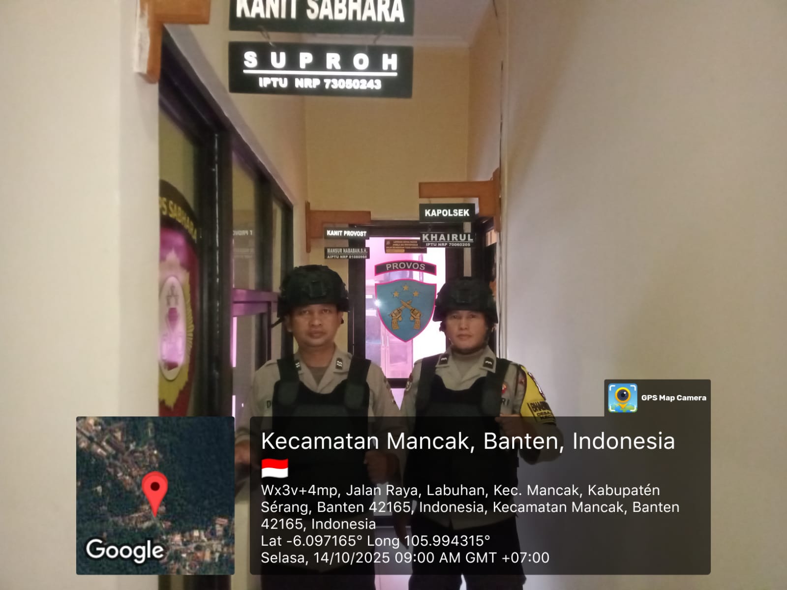 “Anggota piket jaga Polsek Mancak AIPTU DODIK SOFYAN Dan AIPDA AGUS YEYEN. K melaksanakan Sispam Mako dilengkapi dengan bodyvest, helm kevlar, dan senjata api salah satu upaya peningkatan kemanan mako guna mencegah hal-hal yang tidak dapat di duga selama pelayan berlangsung.”