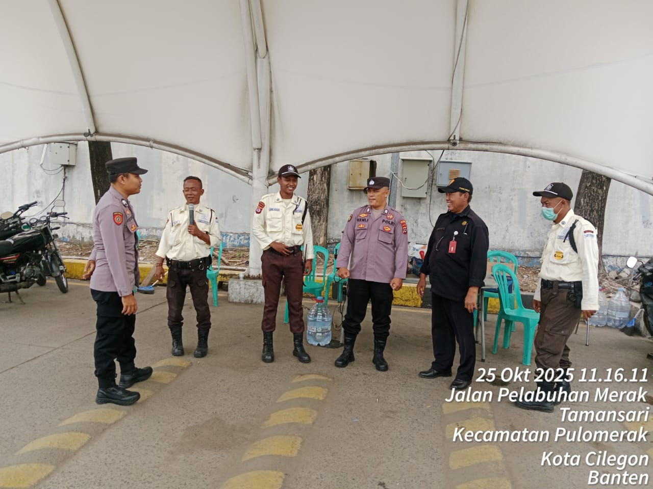 Cilegon - Personel Polsek Kskp Merak Polres Cilegon Polda Banten melaksanakan sambang dan patroli kawasan pelabuhan merak dalam rangka menjaga Harkamtibmas di Kawasan Pelabuhan Merak, Sabtu (25/10/2025).