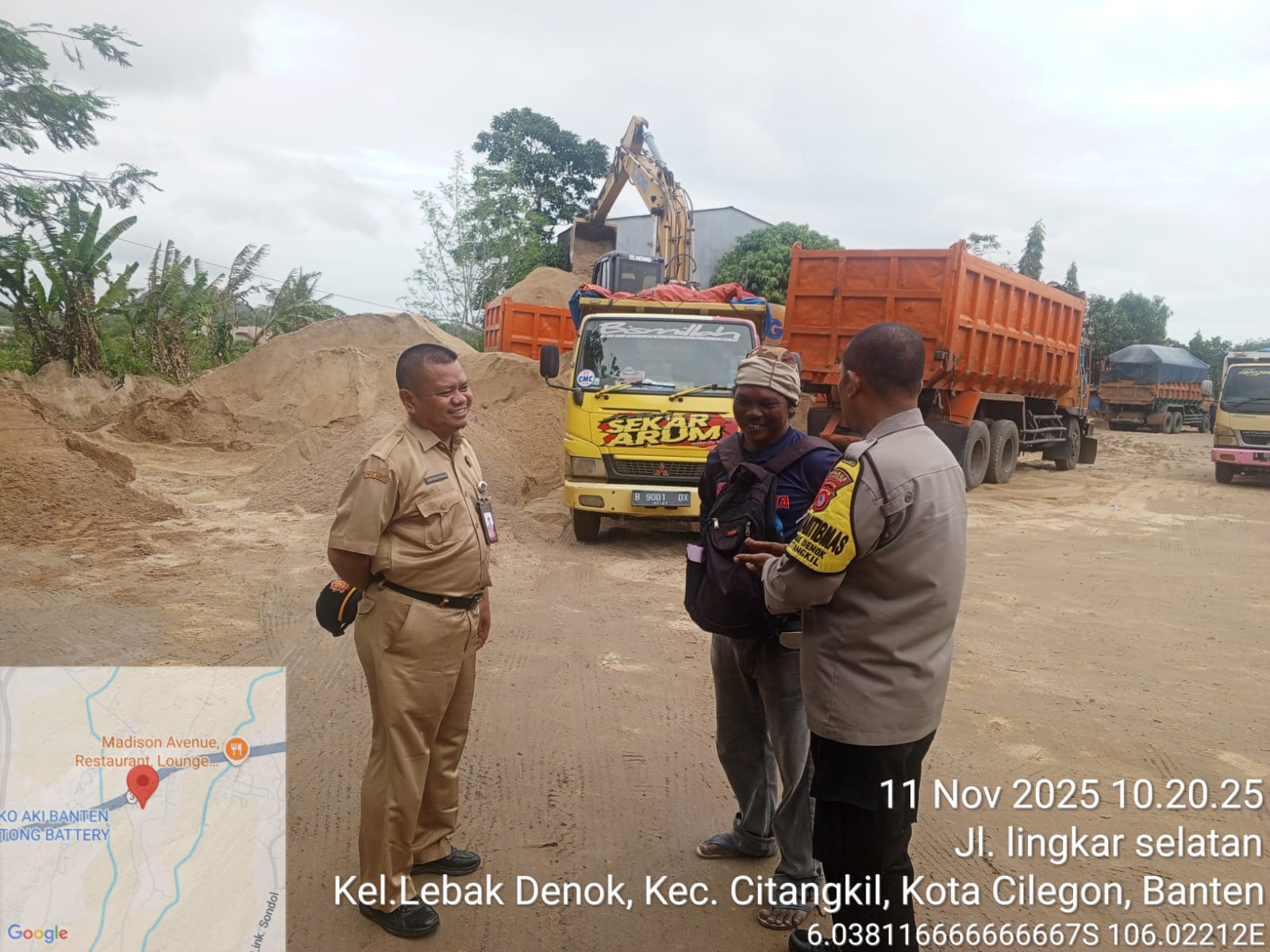 Cilegon - Panit Lantas Polsek Ciwandan IPTU Deni Mulyana dan Bhabinkamtibmas Kelurahan Tamanbaru AIPDA Ediyanto melaksanakan monitoring stokfile pasir di Lingkungan Kubang Lesung Pabuaran PT. Pamungkas Perkasa, Kelurahan Tamanbaru, Kecamatan Citangkil, Kota Cilegon, Selasa (11/11/2025).