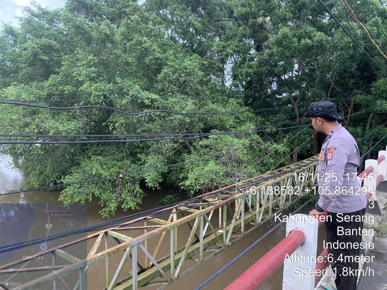 Piket Polsek Cinangka secara rutin melakukan pengecekan kondisi sungai dan berkoordinasi dengan pihak terkait untuk memantau perkembangan debit air. Pemantauan ini juga melibatkan partisipasi aktif dari masyarakat setempat.