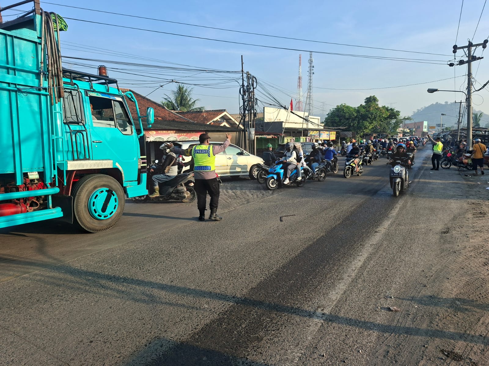 Ciptakan Situasi Lalu Lintas Aman, Bripka Susilo Polsek Bojonegara Laksanakan Gatur Lalin Sore Hari Di Pertigaan Wadas Bojonegara
