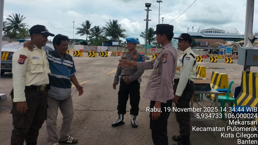 Cilegon - Personel Polsek Kskp Merak Polres Cilegon Polda Banten melaksanakan sambang dan patroli kawasan pelabuhan merak dalam rangka menjaga Harkamtibmas di Kawasan Pelabuhan Merak, Rabu (19/11/2025).
