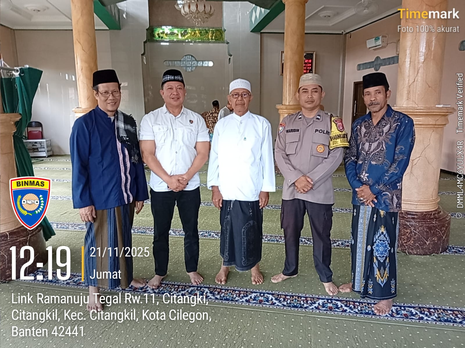 Cilegon - Bhabinkamtibmas Polsek Ciwandan Polres Cilegon Polda Banten Selesai melaksanakan Sholat secara berjama’ah dan Sampaikan Himbauan-himbauan Kamtibmas Kepada Masyarakat Jama'ah Yang ada Dimasjid, Jum'at (21/11/2025).