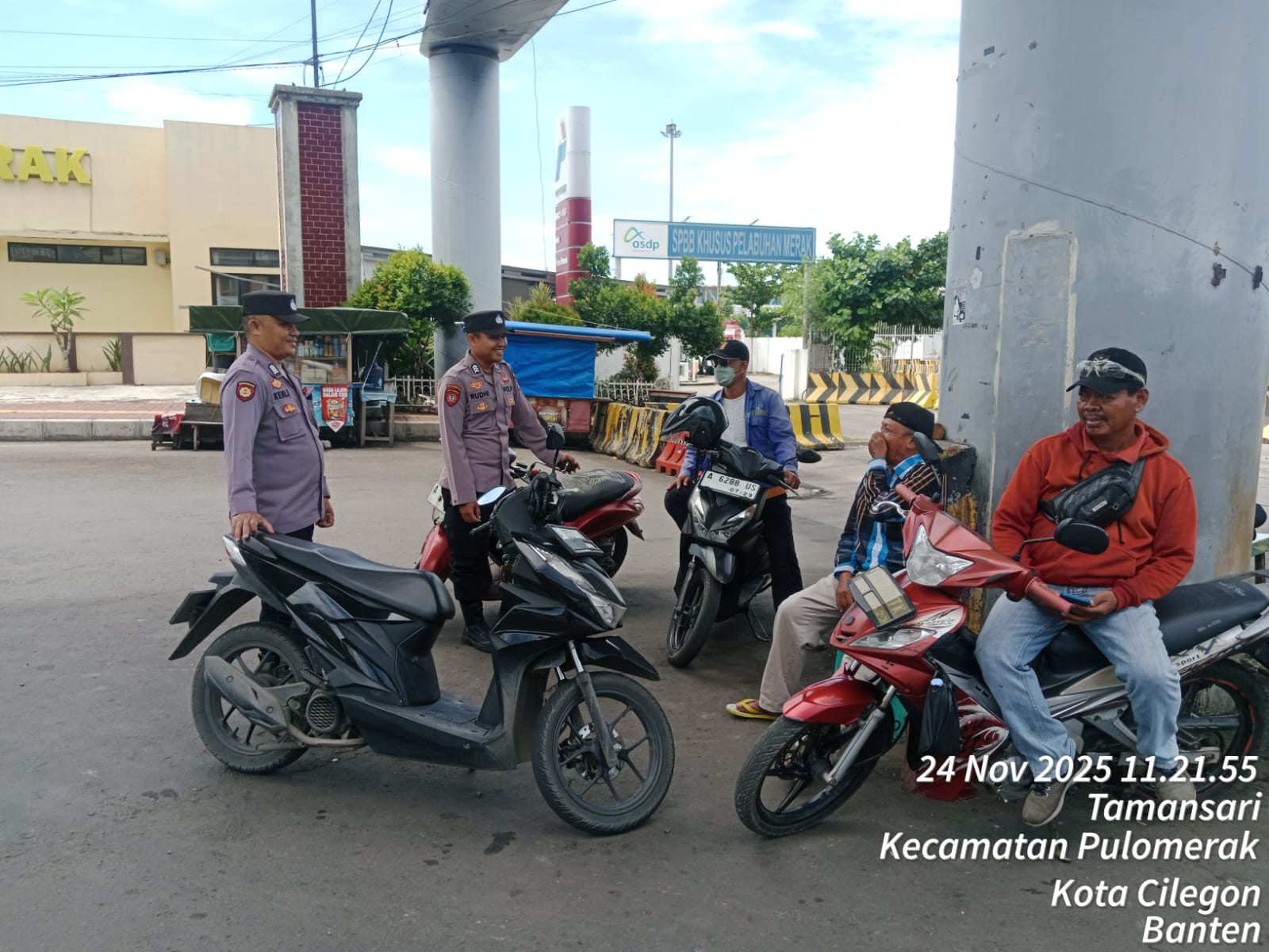 Cilegon - Personel Polsek Kskp Merak Polres Cilegon Polda Banten melaksanakan sambang dan patroli kawasan pelabuhan merak dalam rangka menjaga Harkamtibmas di Kawasan Pelabuhan Merak, Senin (24/11/2025).