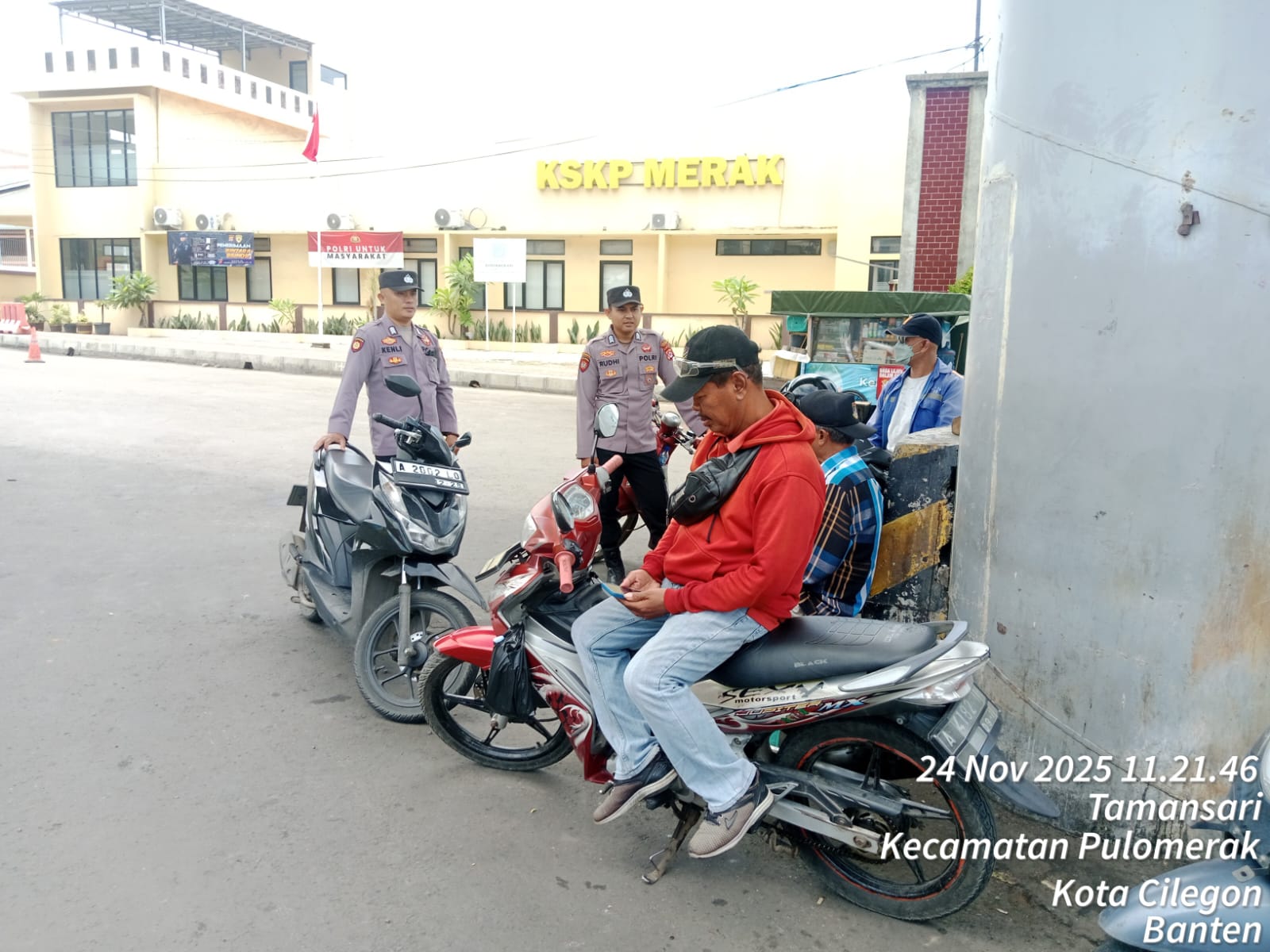 Cilegon - Personel Polsek Kskp Merak Polres Cilegon Polda Banten melaksanakan sambang dan patroli kawasan pelabuhan merak dalam rangka menjaga Harkamtibmas di Kawasan Pelabuhan Merak, Senin (24/11/2025).