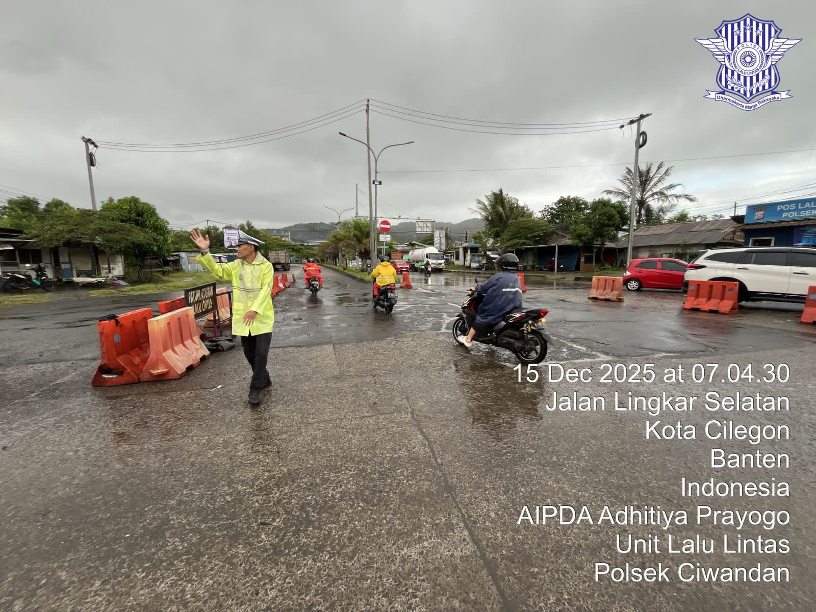 Cilegon - Unit Lalu-lintas Polsek Ciwandan Polres Cilegon Polda Banten Turunkan Personilnya melaksanakan pengaturan lalu lintas di Simpang JLS Ciwandan Pertigaan PT. Cemindo kelurahan Kepuh Kecamatan Ciwandan Kota Cilegon, Senin (15/12/2025).