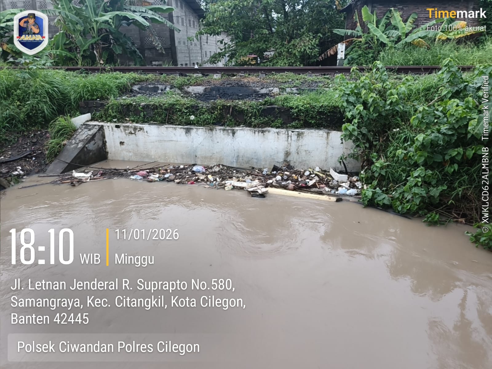 Cilegon - Dalam rangka antisipasi bencana alam personil Polsek ciwandan mengecek debit air di beberapa titik aliran sungai salah satunya yaitu kalimuk RT 005 RW 006 Kelurahan samang Raya Kecamatan citangkil Kota Cilegon, Minggu (11/01/2026).