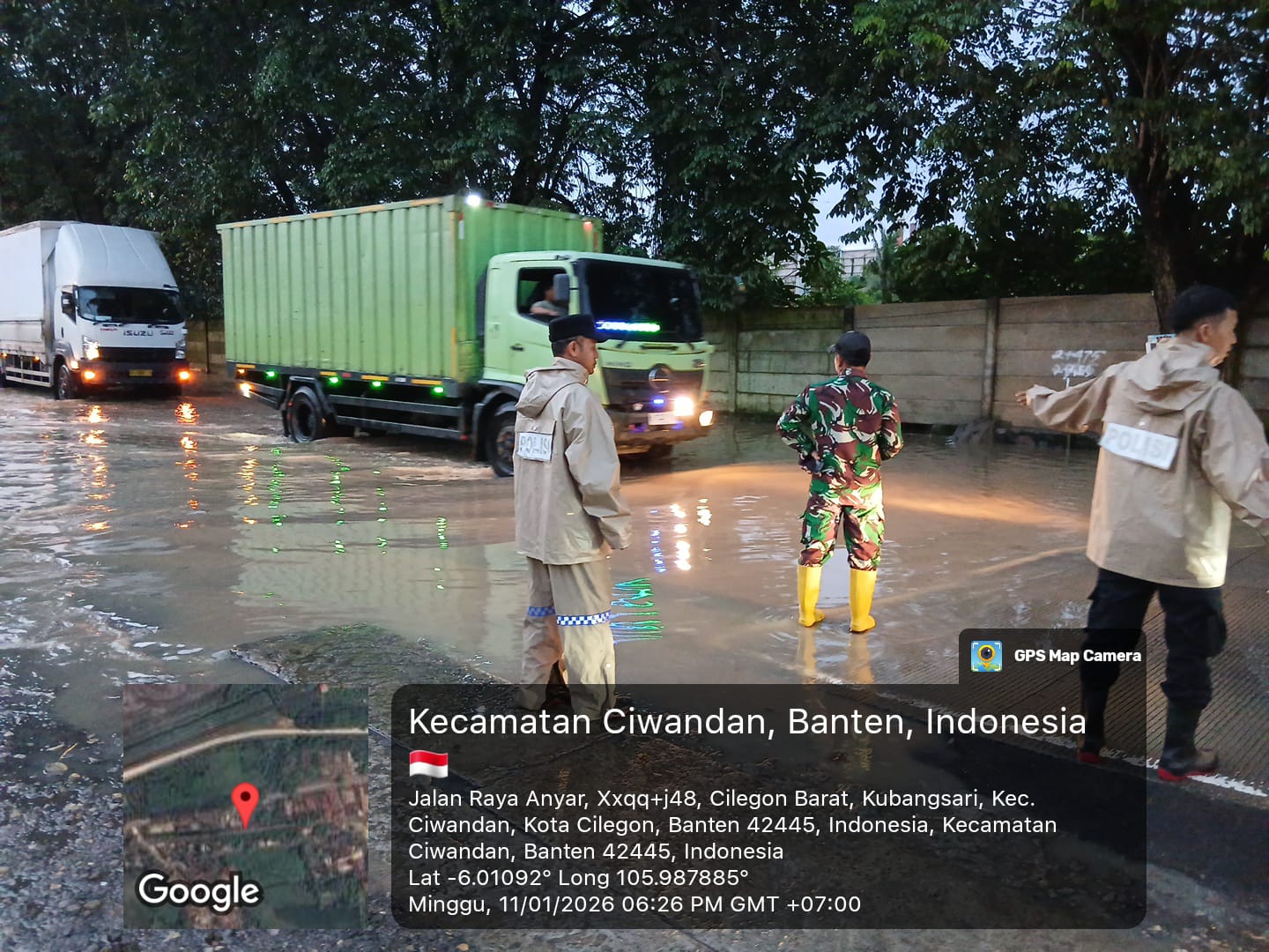 Dalam upaya penanganan dampak Banjir/ Genangan Air di Jalan Raya Ciwandan – Anyer didepan Koramil Ciwandan Dan kawasan Kiec II Kelurahan Tegal Ratu Kecamatan Ciwandan Kota Cilegon dengan ketinggian debit air 40 cm sehingga jalur 2 (dua) arah tidak dapat dilintasi oleh kendaraan baik R2 maupun R4 pribadi, tuturnya.